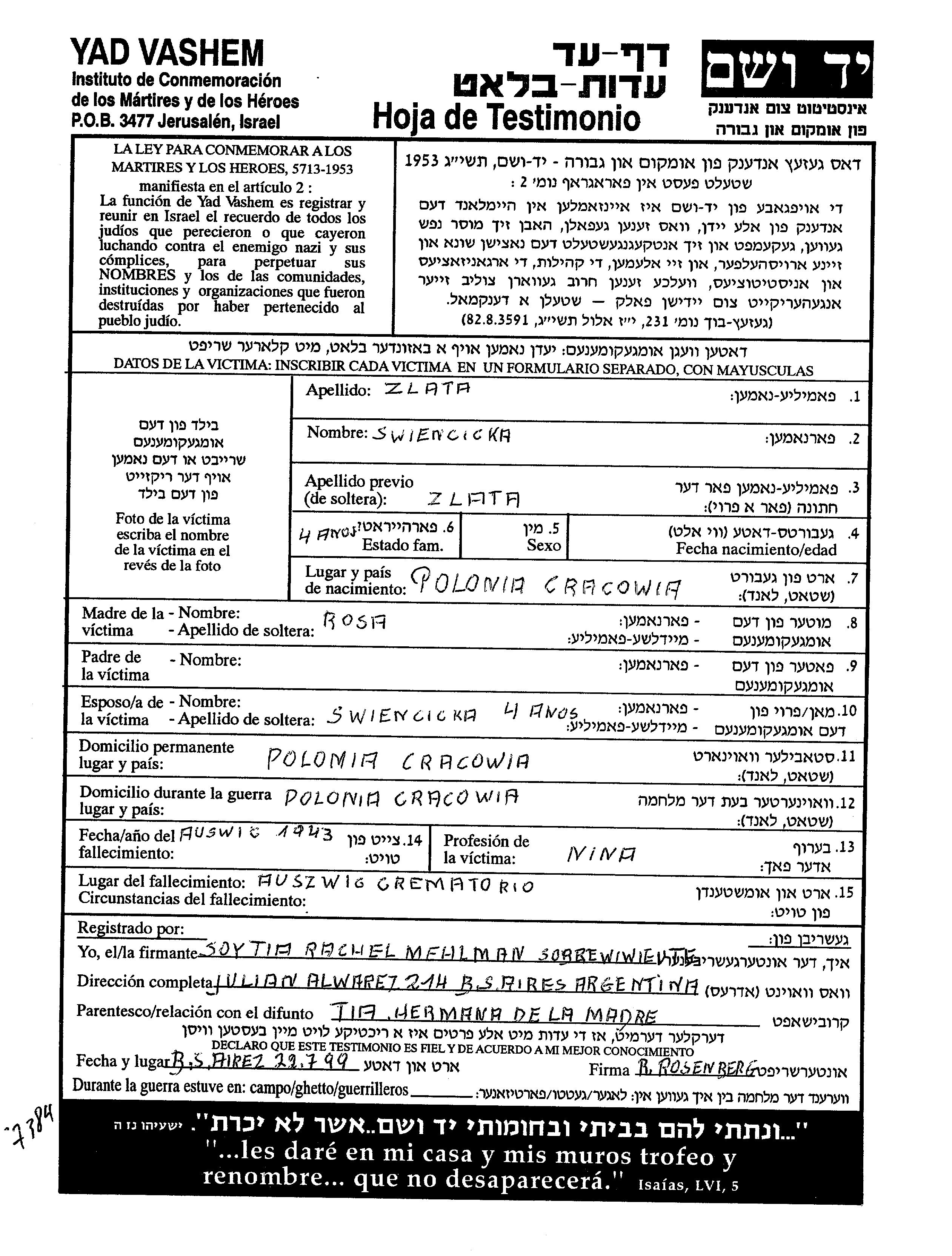 Zlata Swiencicka wurde in Krakow, Polen geboren. Sie war Kind. Vor dem Zweiten Weltkrieg lebte sie in Krakow, Polen. Während des Krieges war sie in Krakow, Polen.