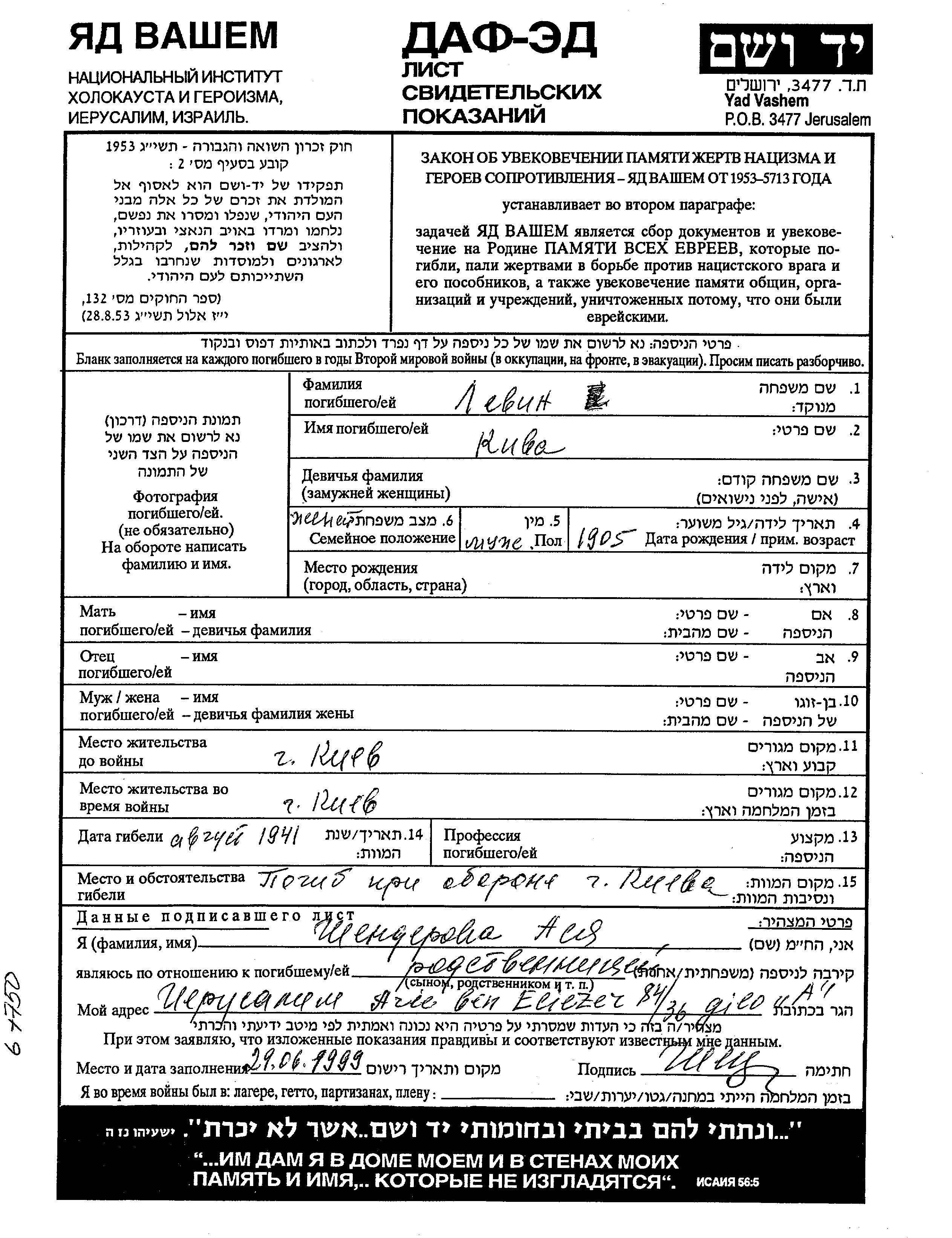Kiva Levin wurde im Jahr 1905 geboren. Er war Verheiratet. Vor dem Zweiten Weltkrieg lebte er in Kiyev, Ukraine (UdSSR). Während des Krieges war er in die Sowjetischen Streitkräfte.