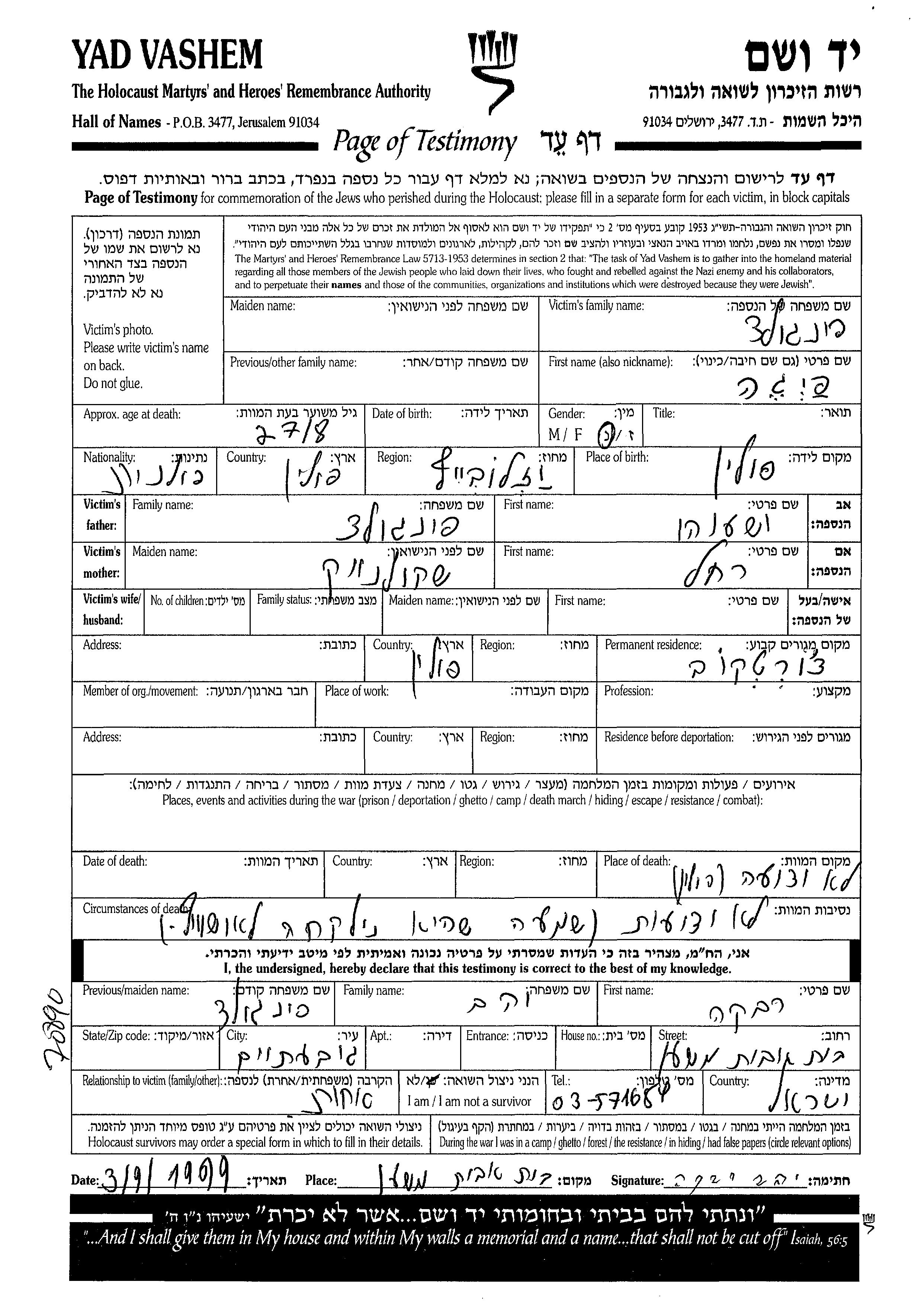 Feiga wurde in der Schoah ermordet. Todesort: Auschwitz, Polen.