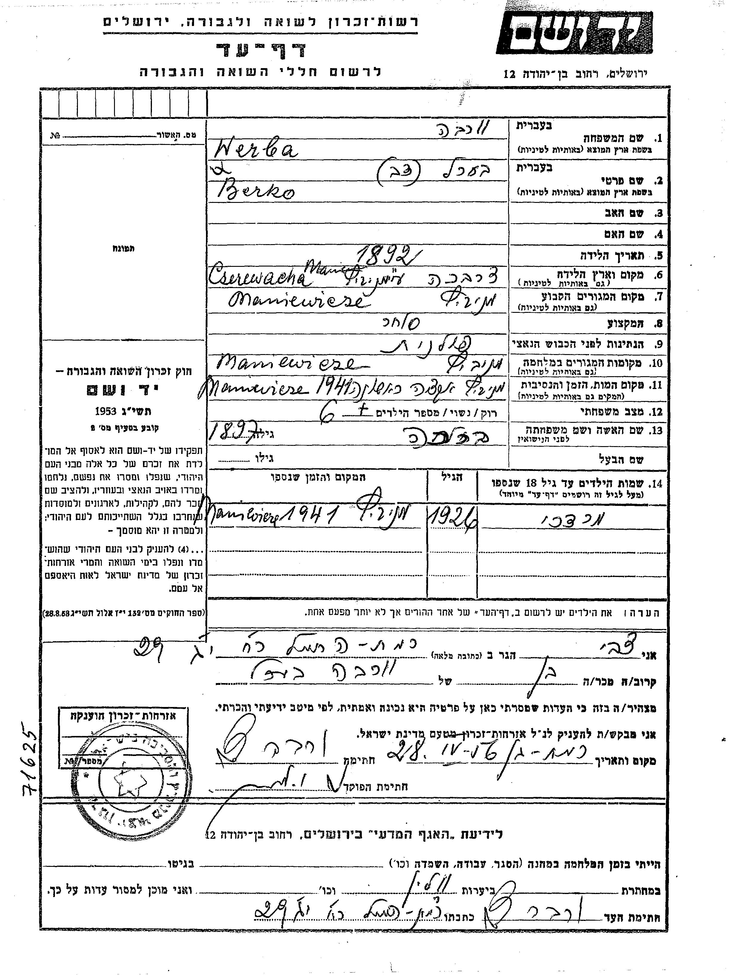 Berko Dov Werba wurde im Jahr 1892 in Czerewacha, Polen geboren. Er war Kaufmann/-frau und mit Brakha Verheiratet. Vor dem Zweiten Weltkrieg lebte er in Maniewicze, Polen. Während des Krieges war er in Maniewicze, Polen.