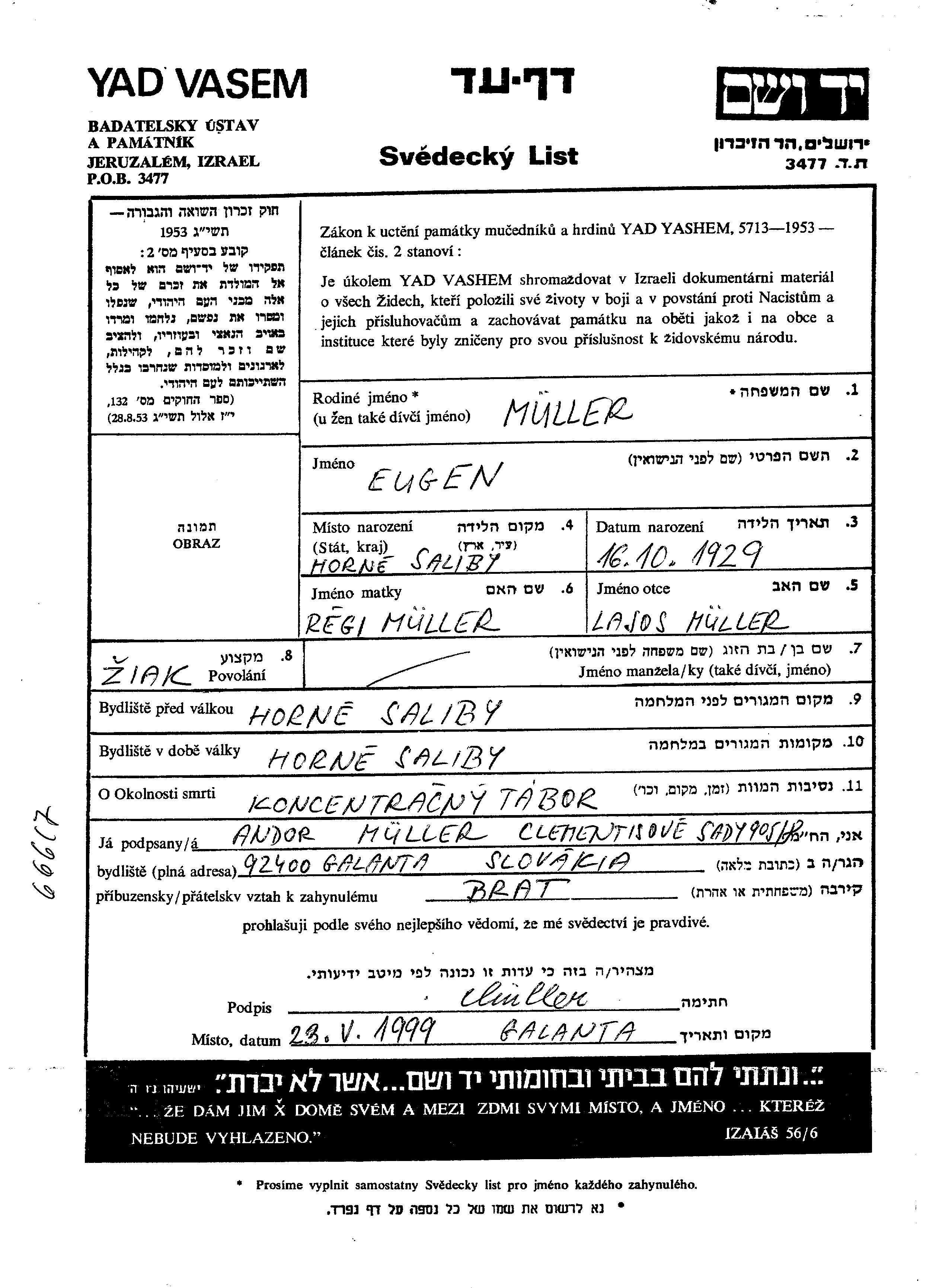 Eugen Müller wurde im Jahr 1929 in Horne Saliby, Tschechoslowakei geboren. Er war der Sohn von Lajos und Regi. Er war Schüler/-in. Vor dem Zweiten Weltkrieg lebte er in Horne Saliby, Tschechoslowakei. Während des Krieges war er in Horne Saliby, Tschechoslowakei.