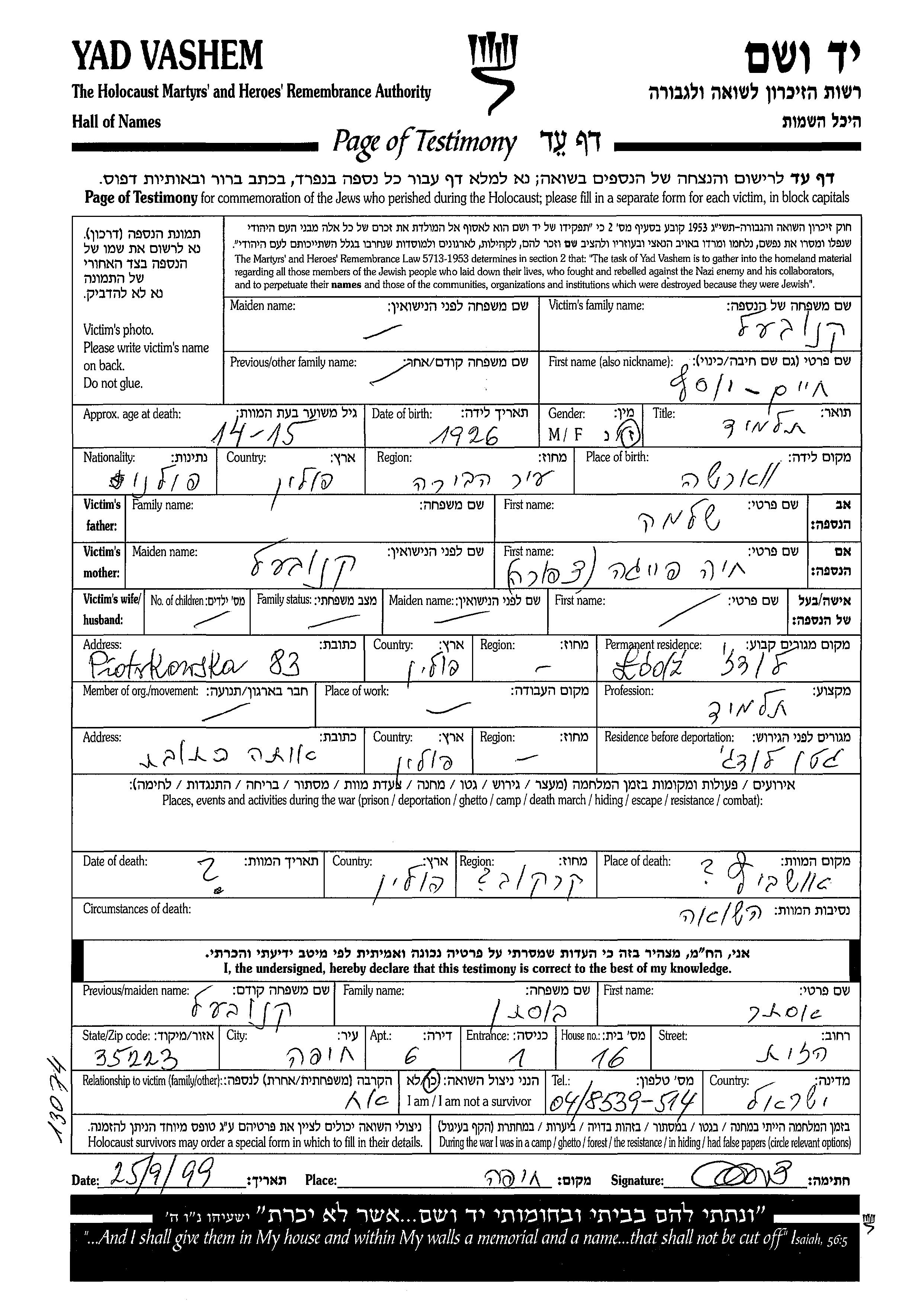 Khaim Yosef wurde in der Schoah ermordet. Todesort: Auschwitz, Polen.