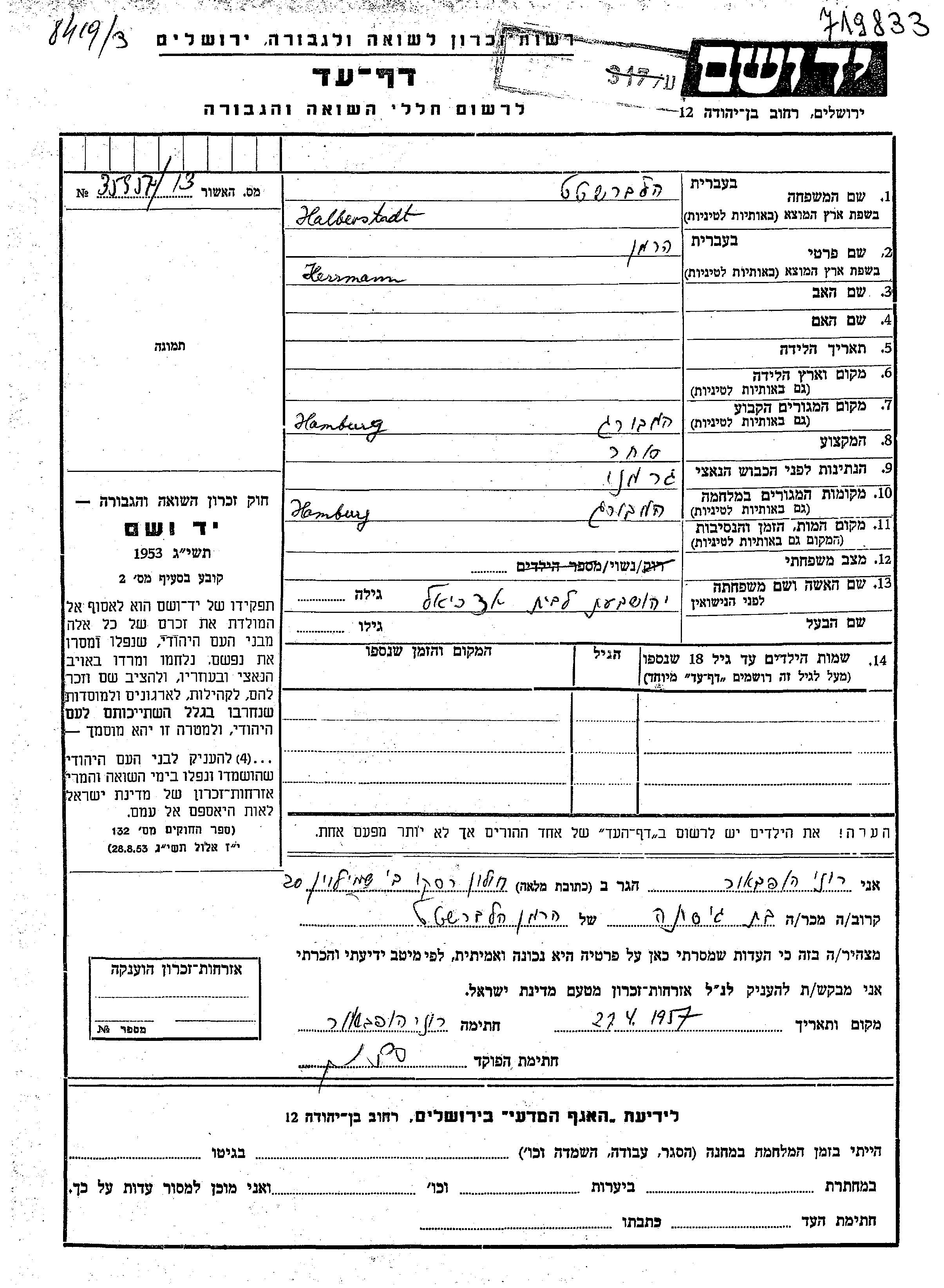 Herrmann Halberstadt. Er war Kaufmann/-frau und mit Yehudit, geb. Azriel Verheiratet. Vor dem Zweiten Weltkrieg lebte er in Hamburg, Deutsches Reich. Während des Krieges war er in Hamburg, Deutsches Reich.