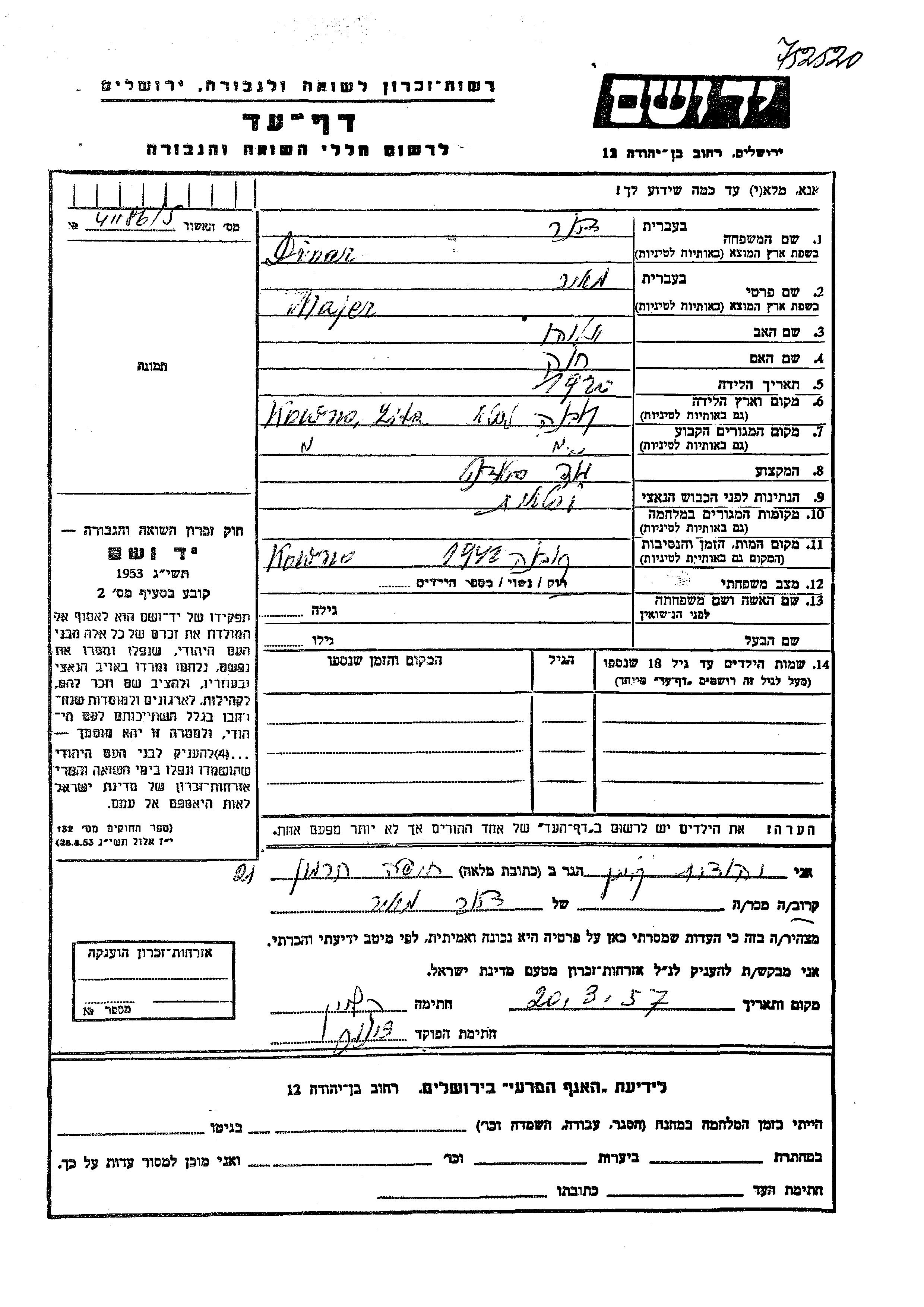 Majer Dinar wurde im Jahr 1920 in Kowno, Litauen geboren. Er war der Sohn von Eliahu und Khana. Er war Student und Ledig. Vor dem Zweiten Weltkrieg lebte er in Kowno, Litauen.