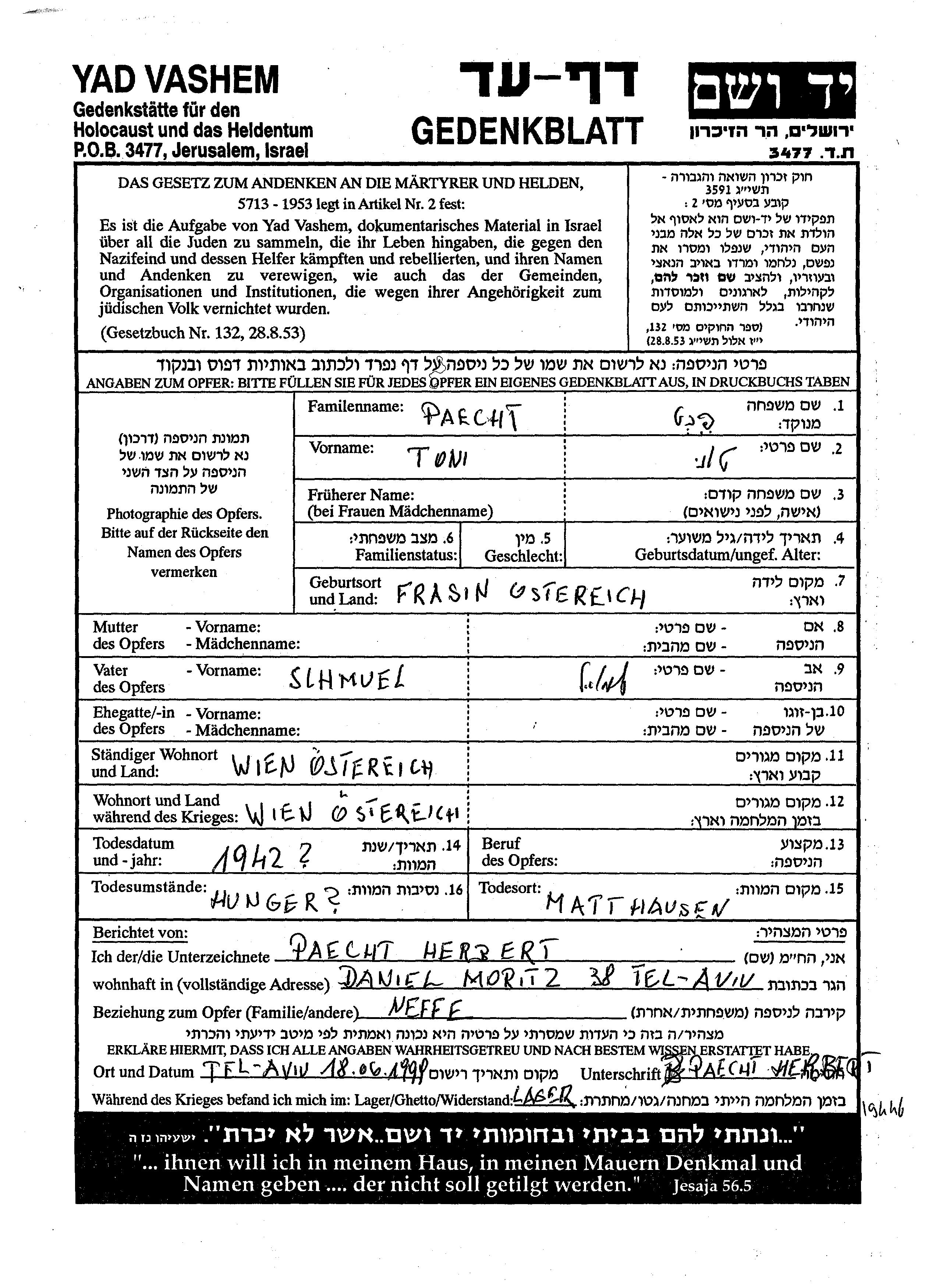 Toni Paecht wurde in Frasin, Rumänien geboren. Er/sie war der/ die Sohn/Tochter von Schmuel. Vor dem Zweiten Weltkrieg er/sie in Wien, Österreich. Während des Krieges war er/sie in Wien, Österreich.