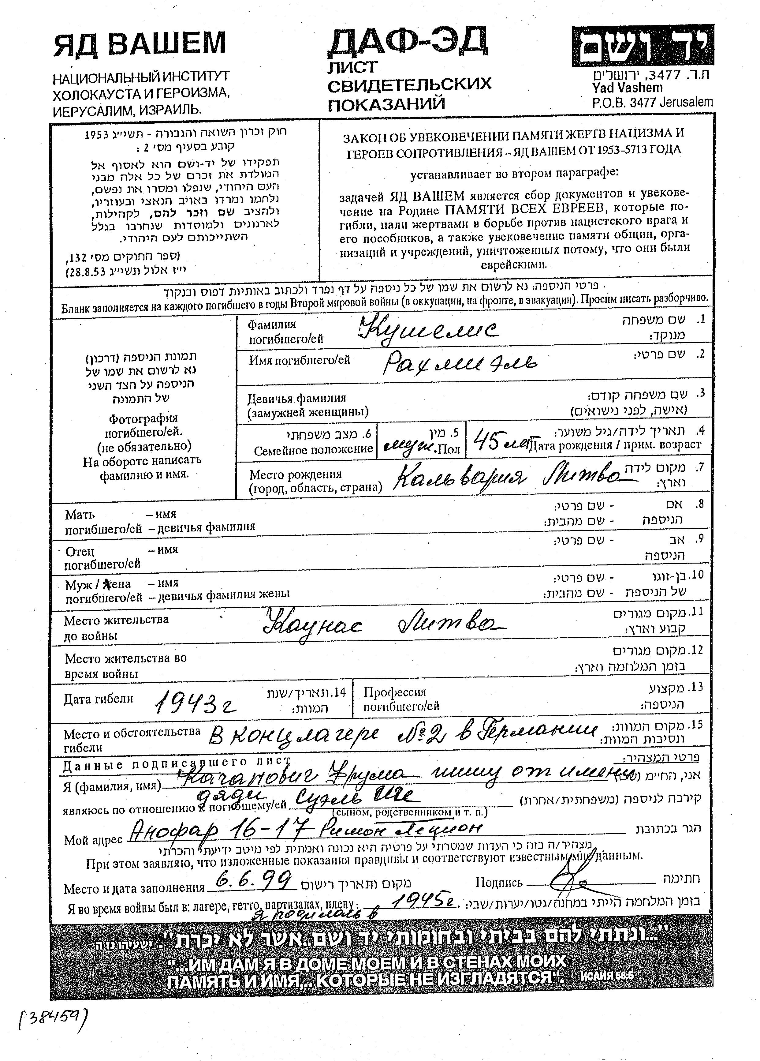 Rakhmiel Kushelis wurde in Kalvaria, Litauen geboren. Vor dem Zweiten Weltkrieg lebte er in Kaunas, Litauen.