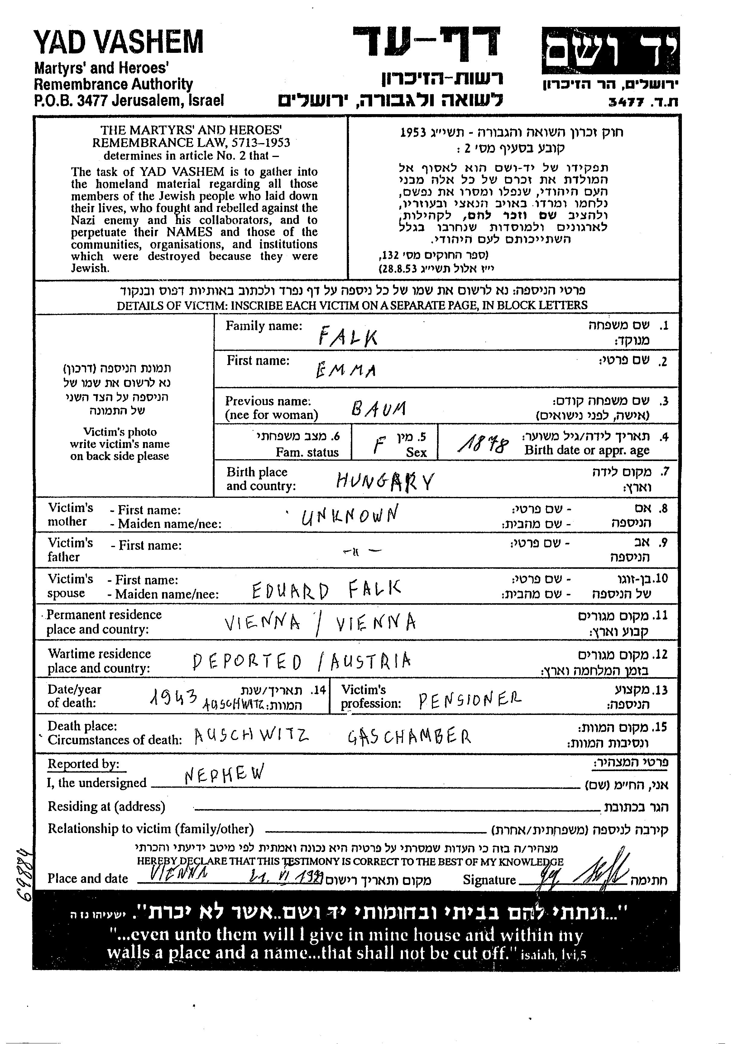 Emma Falk, geb. Baum wurde im Jahr 1878 in Ungarn geboren. Sie war Rentner/-in. Vor dem Zweiten Weltkrieg lebte sie in Vienna, Österreich. Während des Krieges war sie in Österreich.