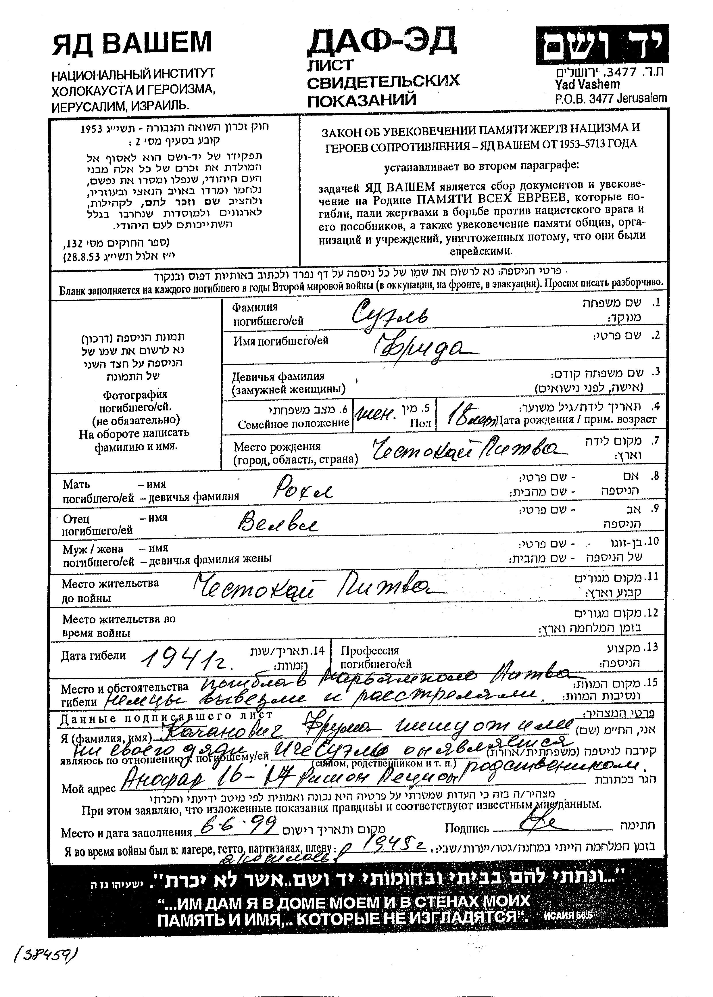 Suel Frida Chestokay, Litauen Gedenkblatt