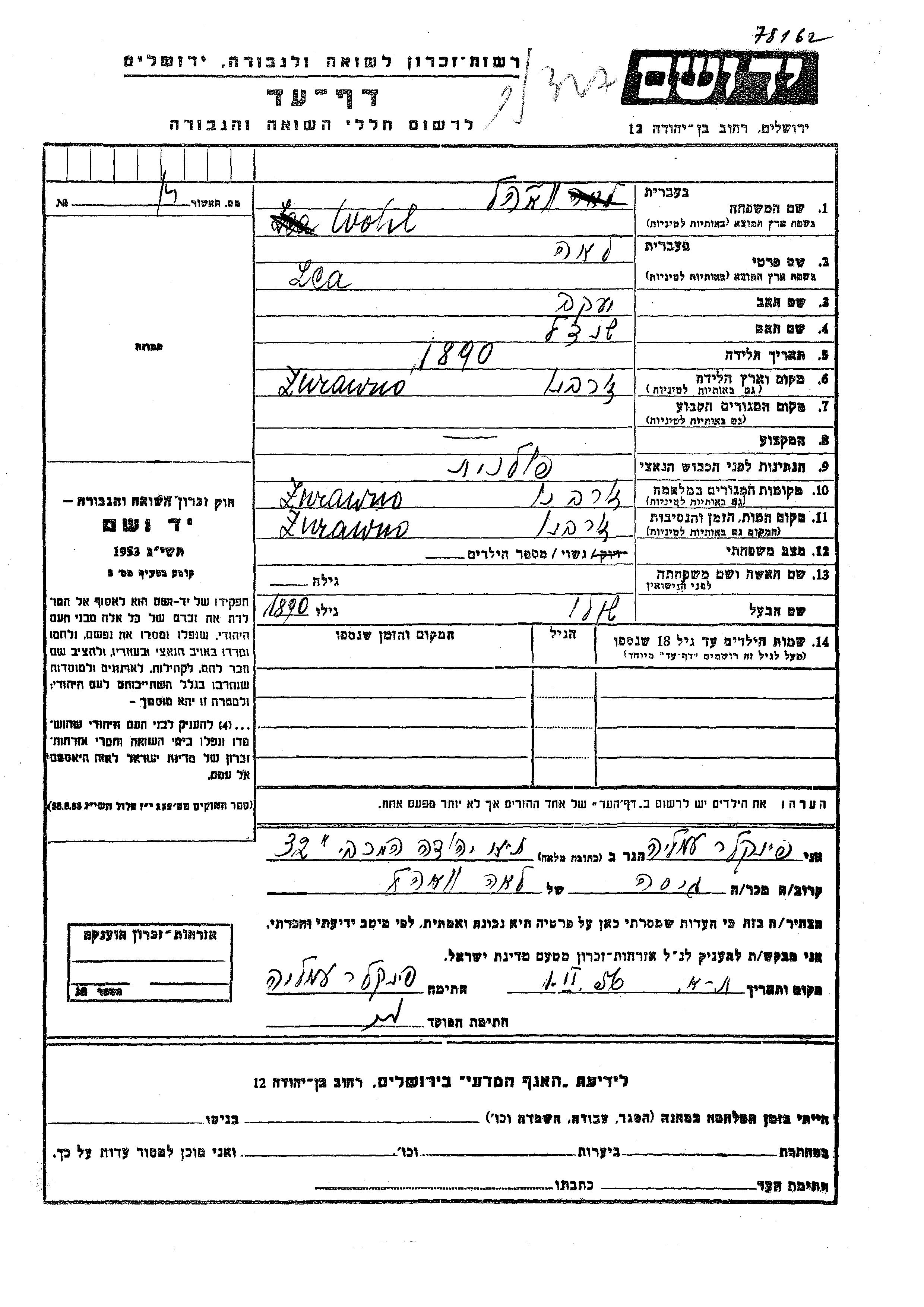 Lea Wola wurde im Jahr 1890 geboren. Er/sie war der/ die Sohn/Tochter von Yaakov und Shendel. Er/Sie war Verheiratet Während des Krieges war er/sie in Zurawno, Polen.