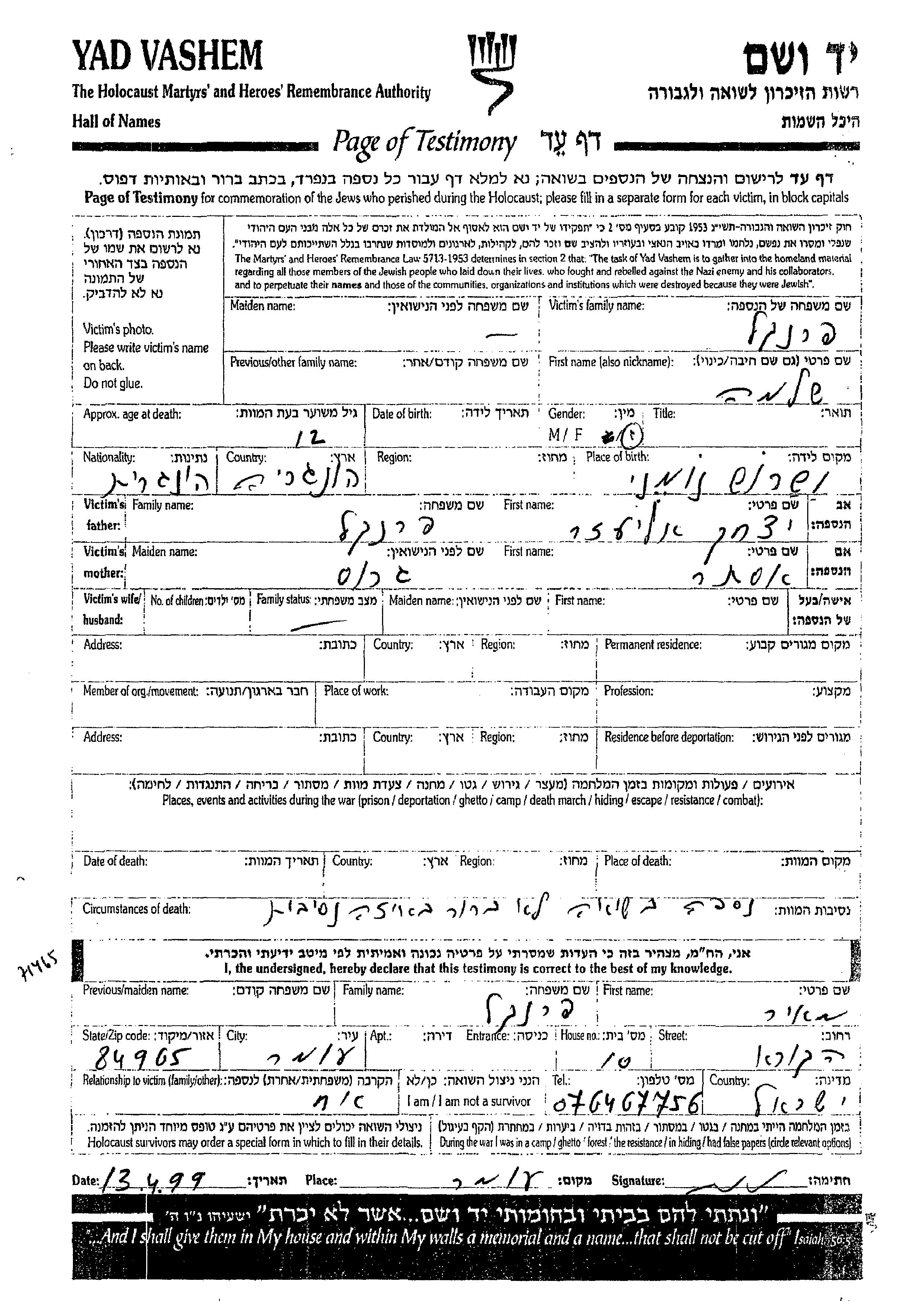 Shlomo wurde in der Schoah ermordet.