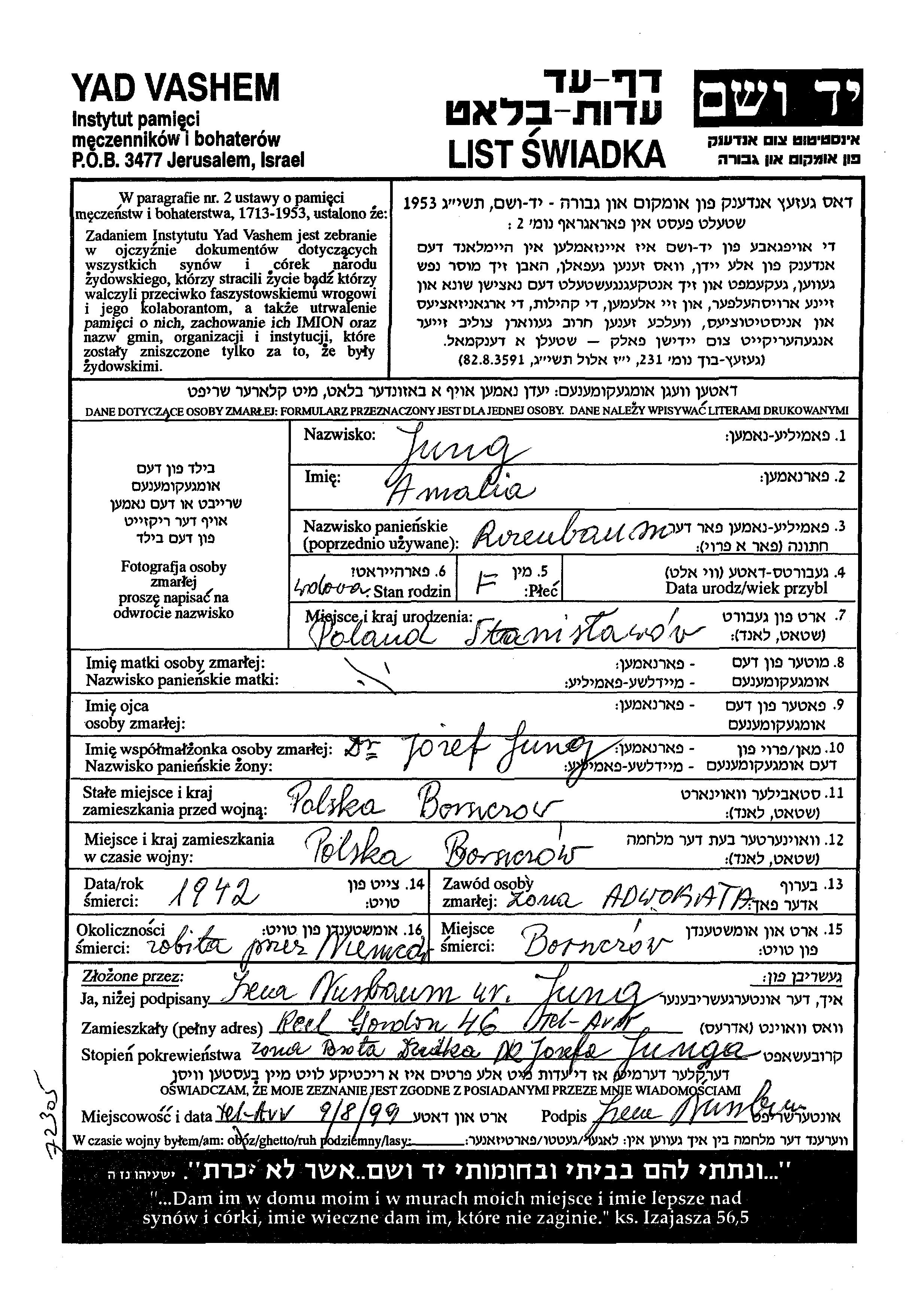 Amalia Jung, geb. Rosenbaum wurde in Stanislawow, Polen geboren. Sie war mit Josef Witwe. Vor dem Zweiten Weltkrieg lebte sie in Borszczow, Polen. Während des Krieges war sie in Borszczow, Polen.