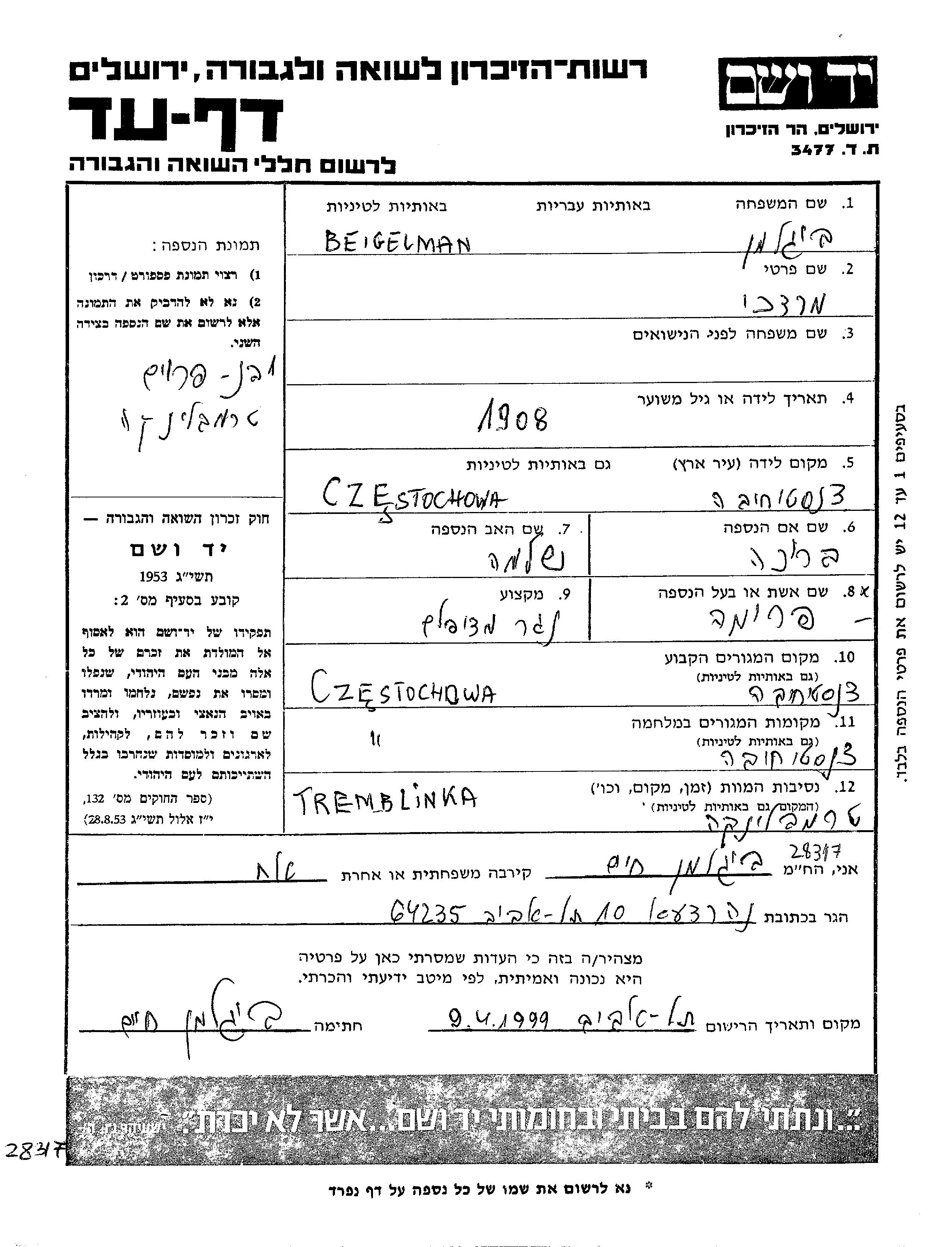 Beigelman Mordekhai 1908 Czestochowa, Polen Gedenkblatt