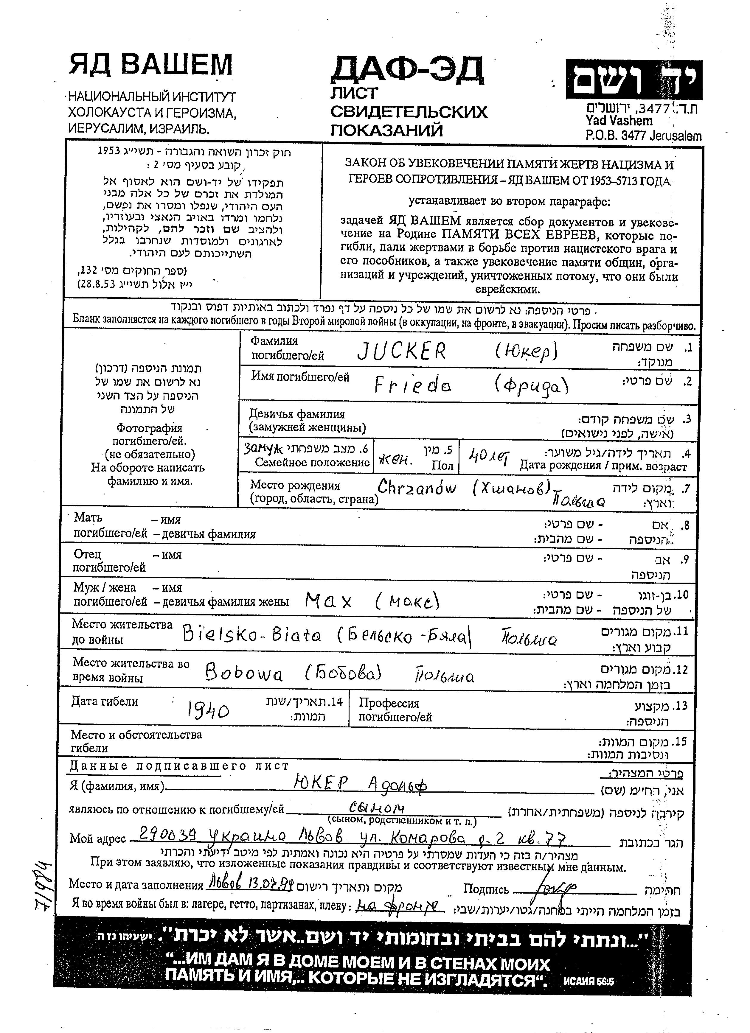 Frieda Jucker wurde in Chrzanow, Polen geboren. Sie war mit Max Verheiratet. Vor dem Zweiten Weltkrieg lebte sie in Bielsko Biala, Polen. Während des Krieges war sie in Bobowa, Polen.