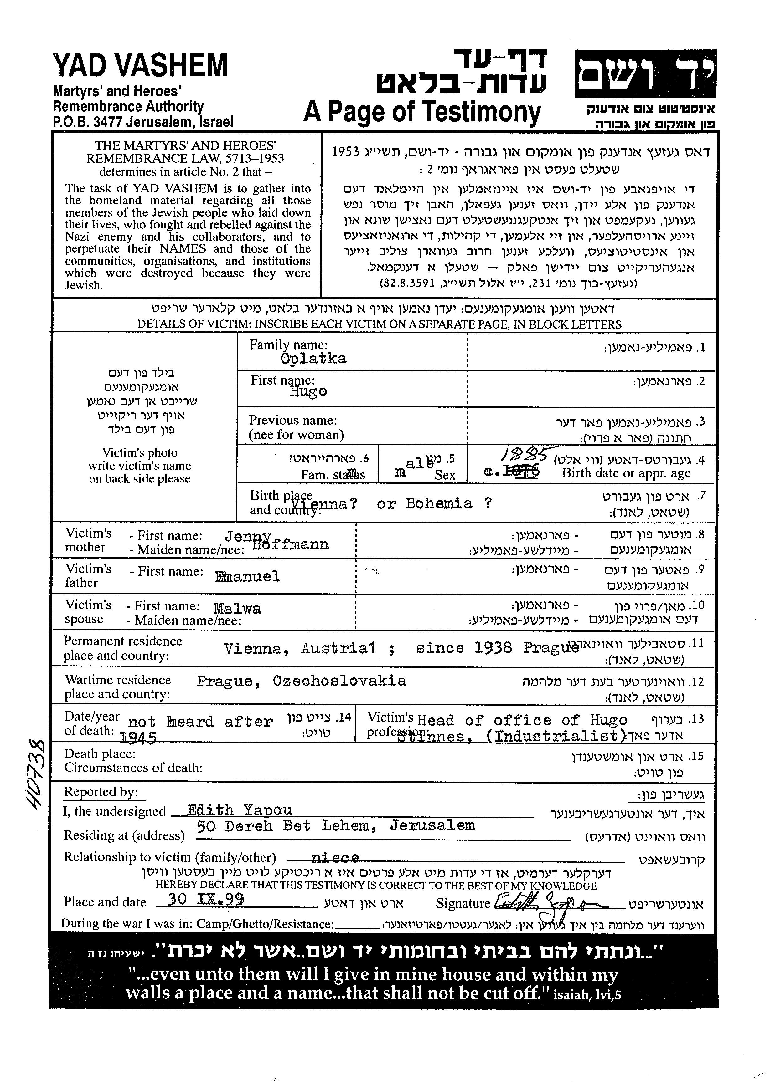Hugo Oplatka wurde im Jahr 1885 in Vienna, Österreich geboren. Er war der Sohn von Emanuel und Jenny. Er war Head of office. Vor dem Zweiten Weltkrieg lebte er in Vienna, Österreich. Während des Krieges war er in Prague, Tschechoslowakei.