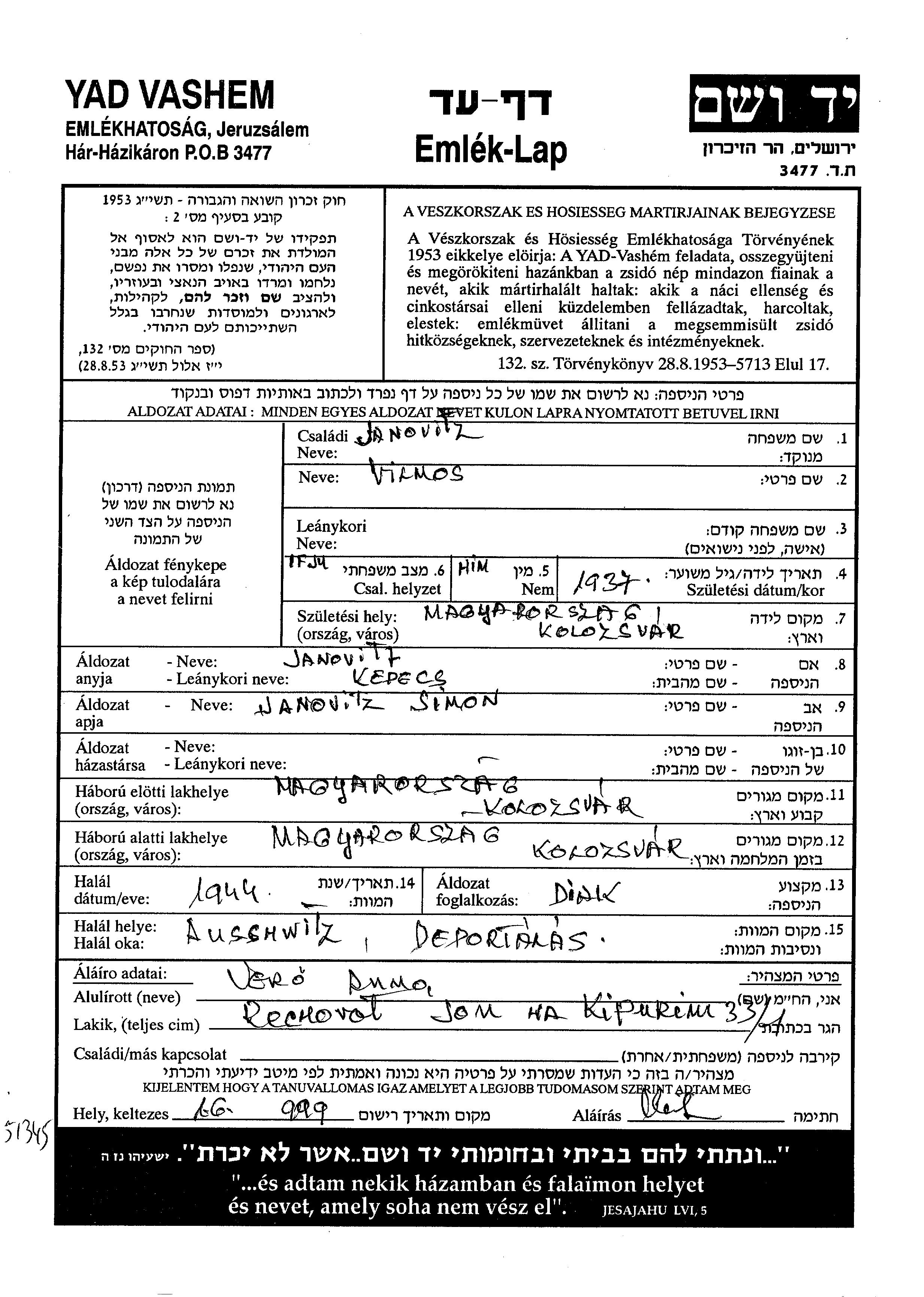 Vilmosh wurde in der Schoah ermordet. Todesort: Auschwitz, Polen im Jahr 1944.