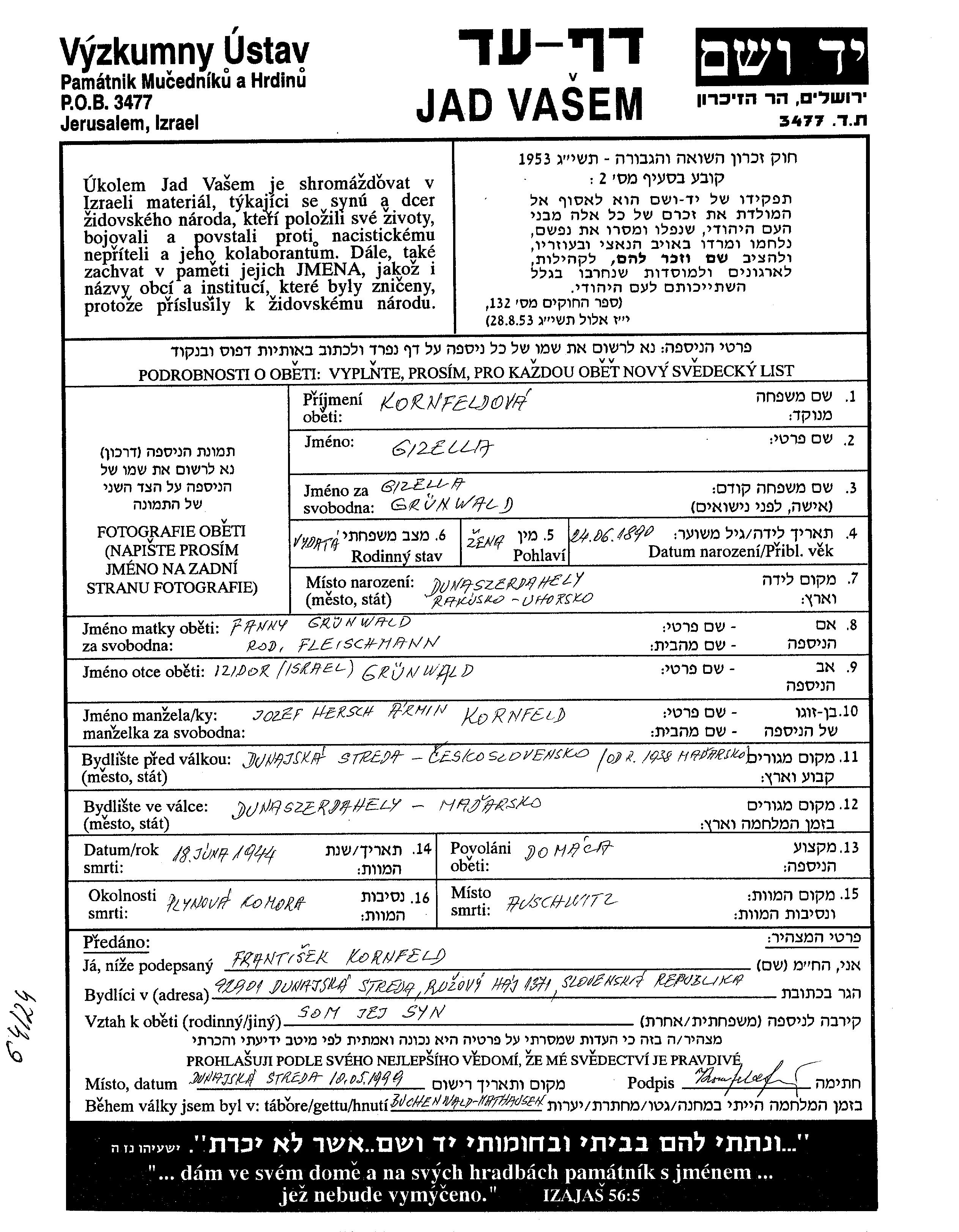 Gizella Kornfeld, geb. Grünwald wurde im Jahr 1890 in Dunaszerdahely, Tschechoslowakei geboren. Sie war die Tochter von Izidor Israel und Fanny. Sie war Domaca und mit Jozef Hersch Verheiratet. Vor dem Zweiten Weltkrieg lebte sie in Dunajska Streda, Tschechoslowakei. Während des Krieges war sie in Dunaszerdehely, Tschechoslowakei.