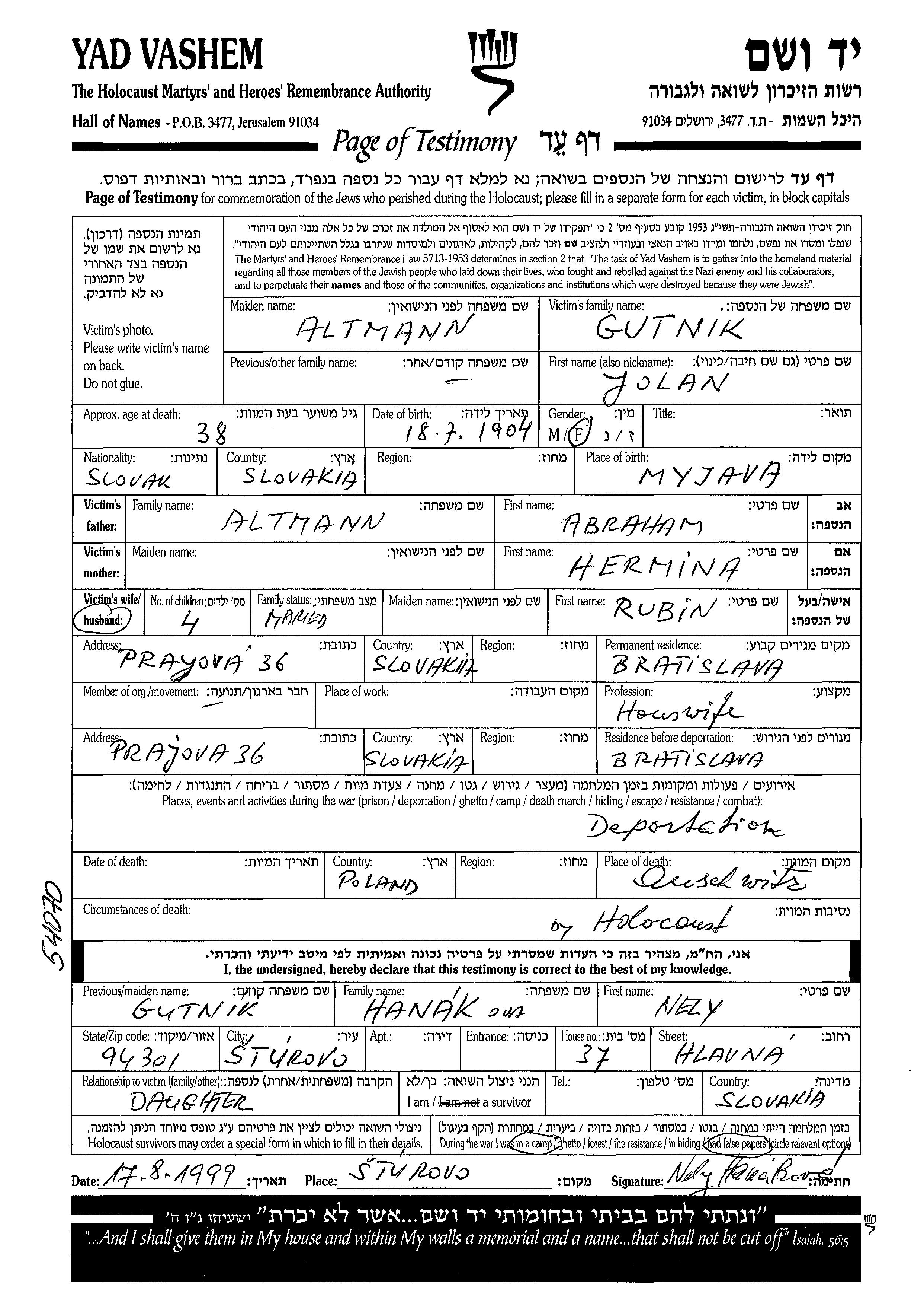 Jolan Gutnik, geb. Altmann wurde im Jahr 1904 in Myjava, Tschechoslowakei geboren. Sie war die Tochter von Abraham und Hermina. Sie war Hausfrau und mit Rubin Verheiratet. Vor dem Zweiten Weltkrieg lebte sie in Bratislava, Tschechoslowakei. Während des Krieges war sie in Bratislava, Tschechoslowakei.