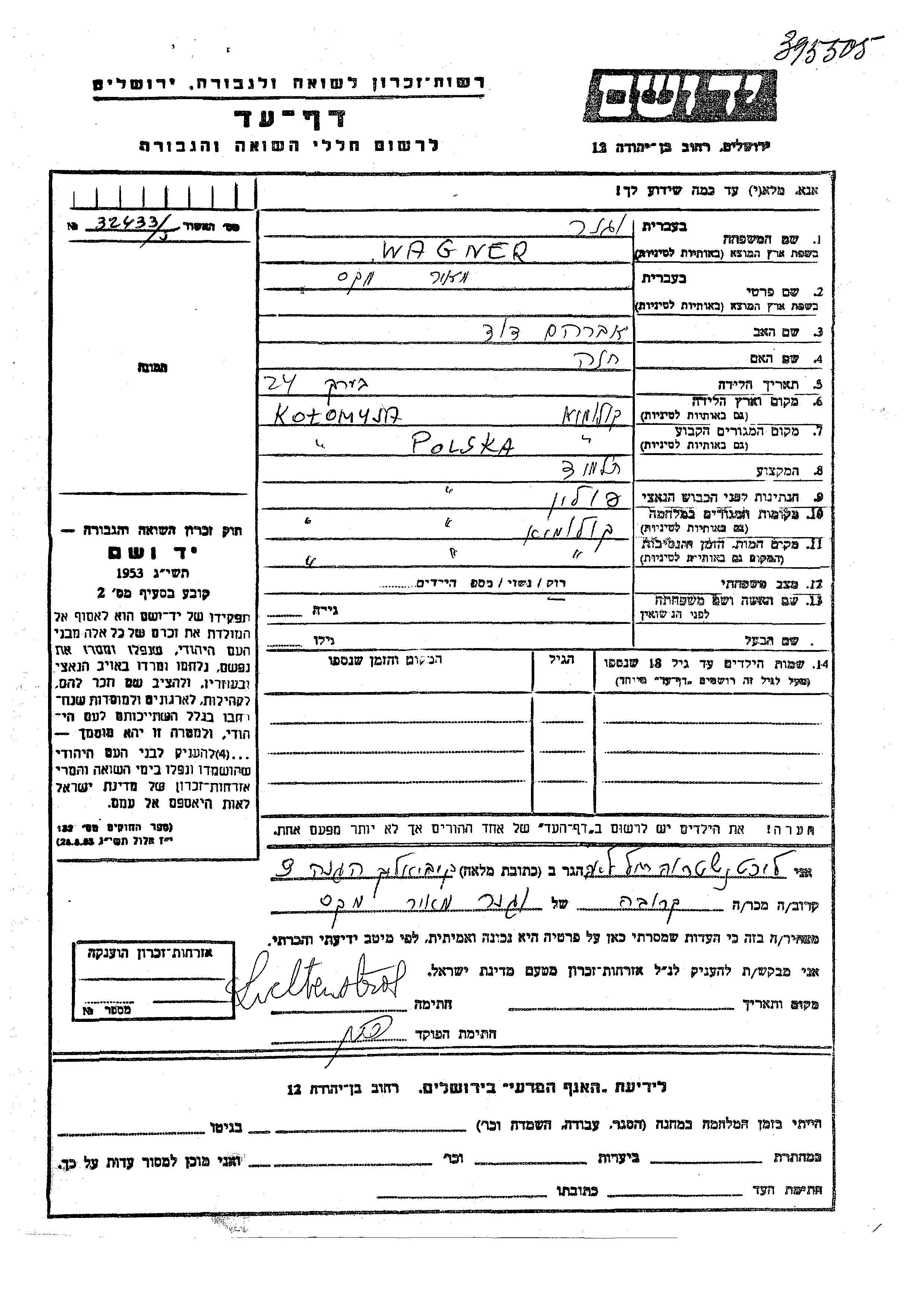 Meir Max Wagner wurde in Kolomyja, Polen geboren. Er war der Sohn von Avraham David und Khana. Er war Schüler/-in und Ledig. Vor dem Zweiten Weltkrieg lebte er in Kolomyja, Polen. Während des Krieges war er in Kolomyja, Polen.