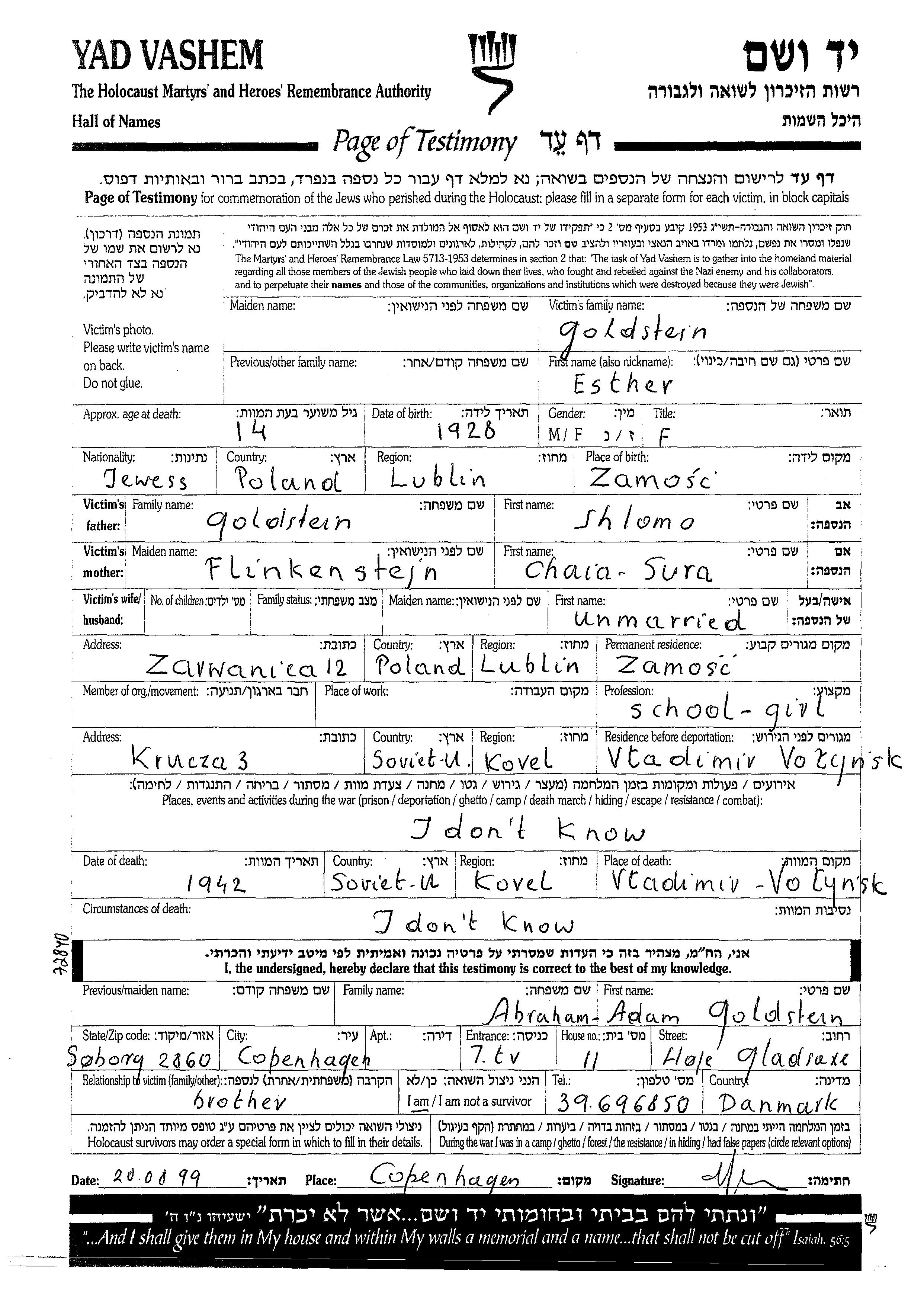 Esther wurde in der Schoah ermordet. Todesort: Vladimir Volynskiy, Polen im Jahr 1942.