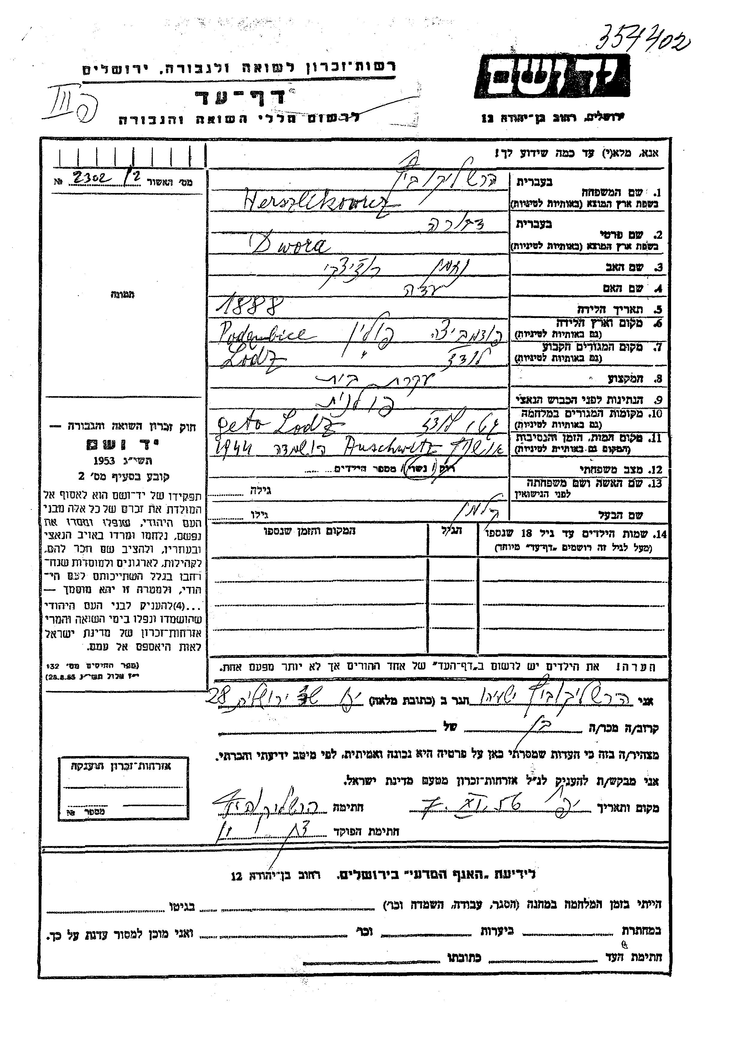 Dwora Herszlikowicz wurde im Jahr 1888 in Podembice, Polen geboren. Sie war die Tochter von Nakhman und Ada. Sie war Hausfrau und mit Kalman Verheiratet. Vor dem Zweiten Weltkrieg lebte sie in Lodz, Polen. Während des Krieges war sie in Lodz, Polen.