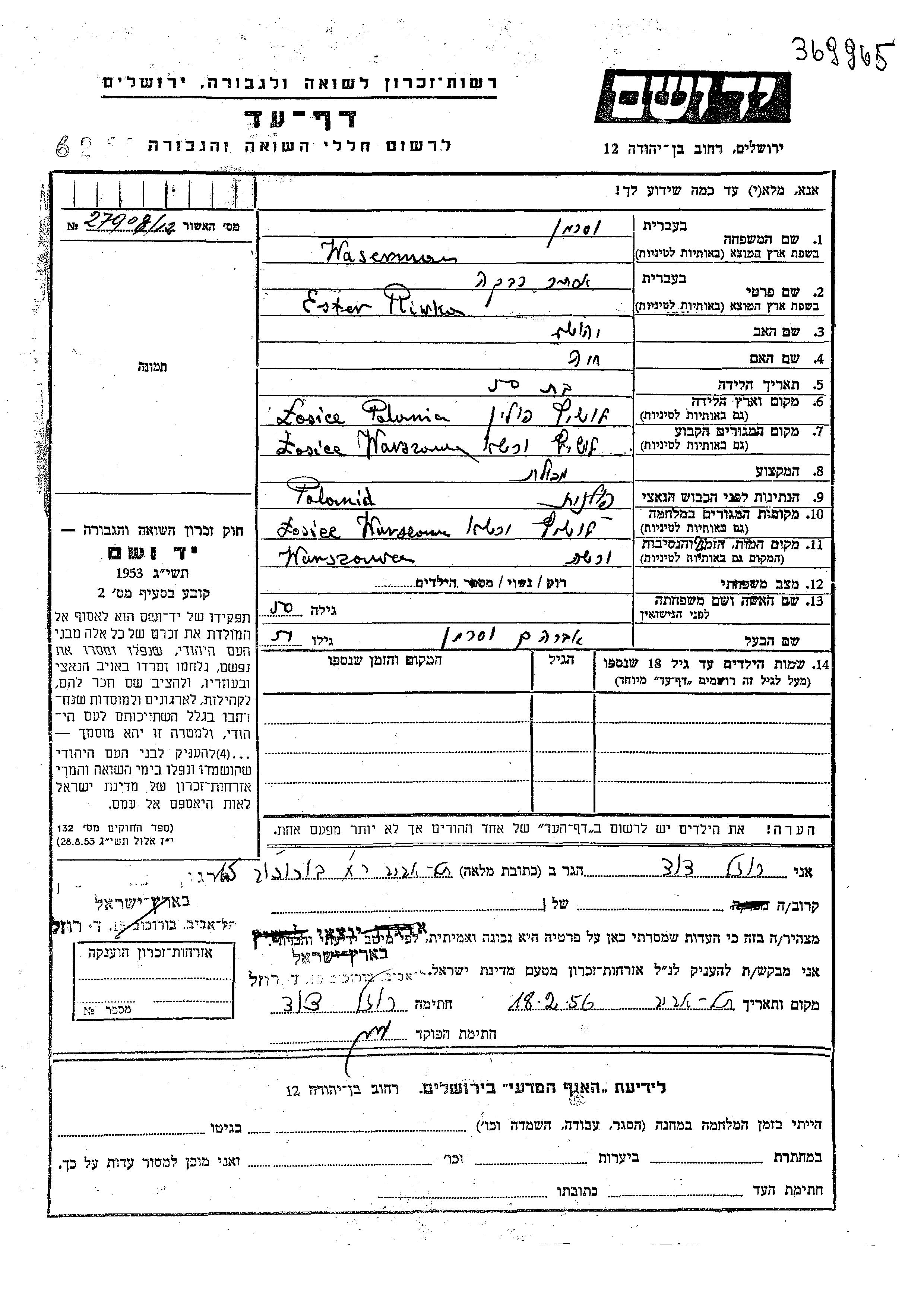 Waserman Riwka Ester Warszawa, Polen Gedenkblatt