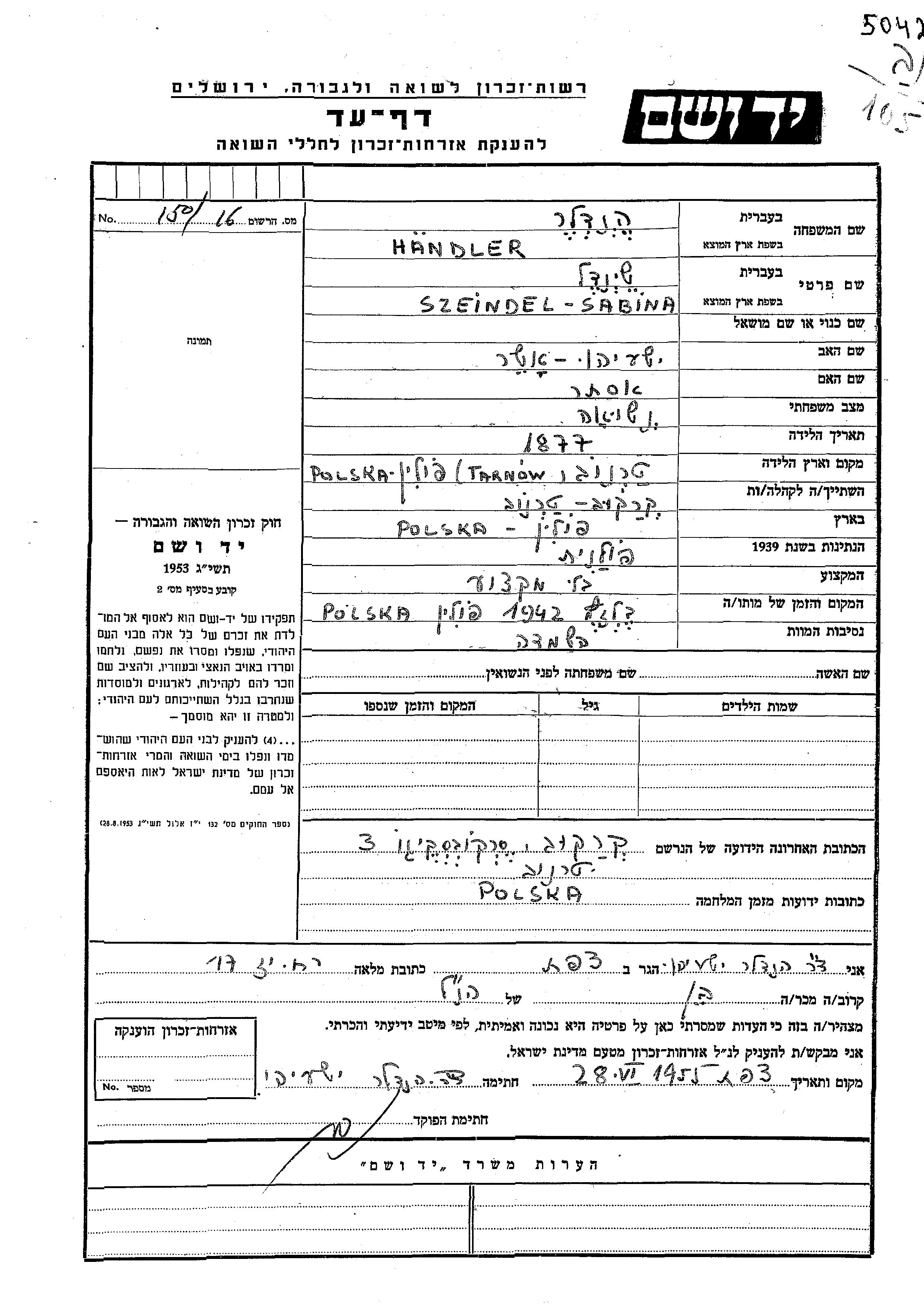 Szeindel Sabina Hendler wurde im Jahr 1877 in Tarnow, Polen geboren. Sie war die Tochter von Yeshayahu Asher und Ester. Vor dem Zweiten Weltkrieg lebte sie in Tarnow, Polen. Während des Krieges war sie in Tarnow, Polen.