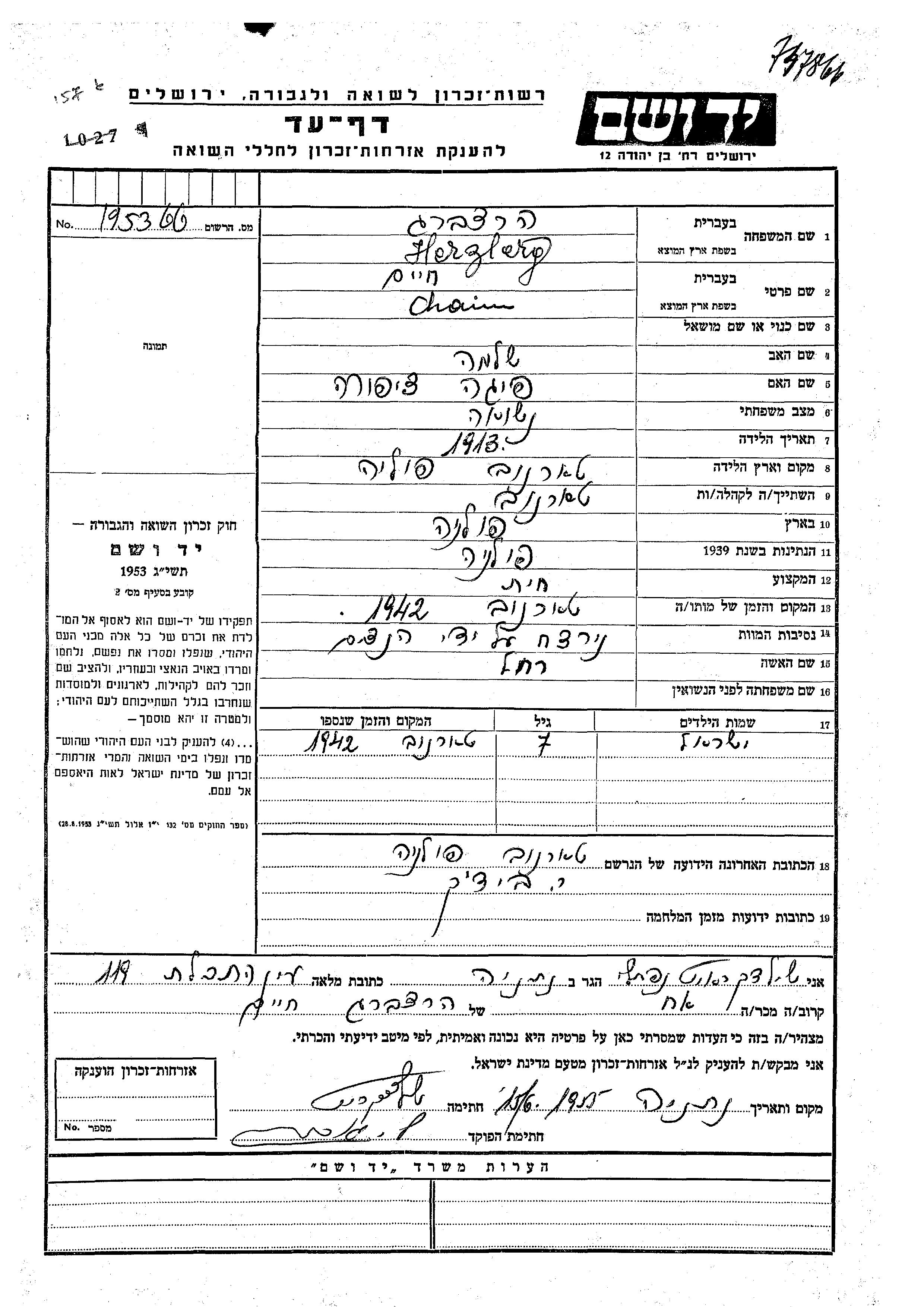 Chaim Hertzberg wurde im Jahr 1913 in Tarnow, Polen geboren. Er war der Sohn von Shlomo und Feiga Tzipora. Er war Schneider und mit Rakhel Verheiratet. Vor dem Zweiten Weltkrieg lebte er in Tarnow, Polen. Während des Krieges war er in Tarnow, Polen.