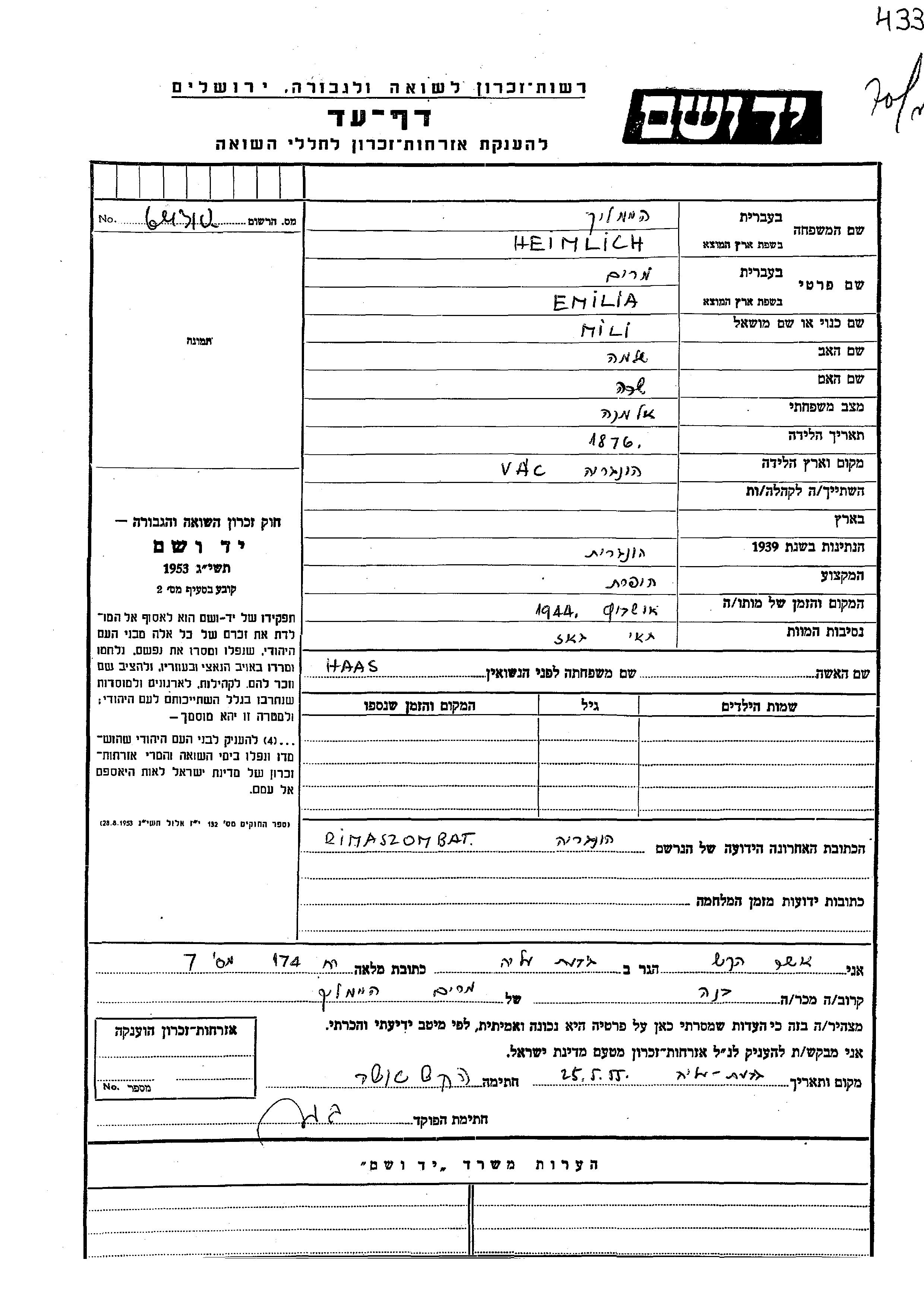 Emilia Miriam Heimlich, geb. Haas wurde im Jahr 1876 in Vac, Ungarn geboren. Sie war die Tochter von Shlomo und Sara. Sie war Schneiderin. Während des Krieges war sie in Rimaszombat, Tschechoslowakei.