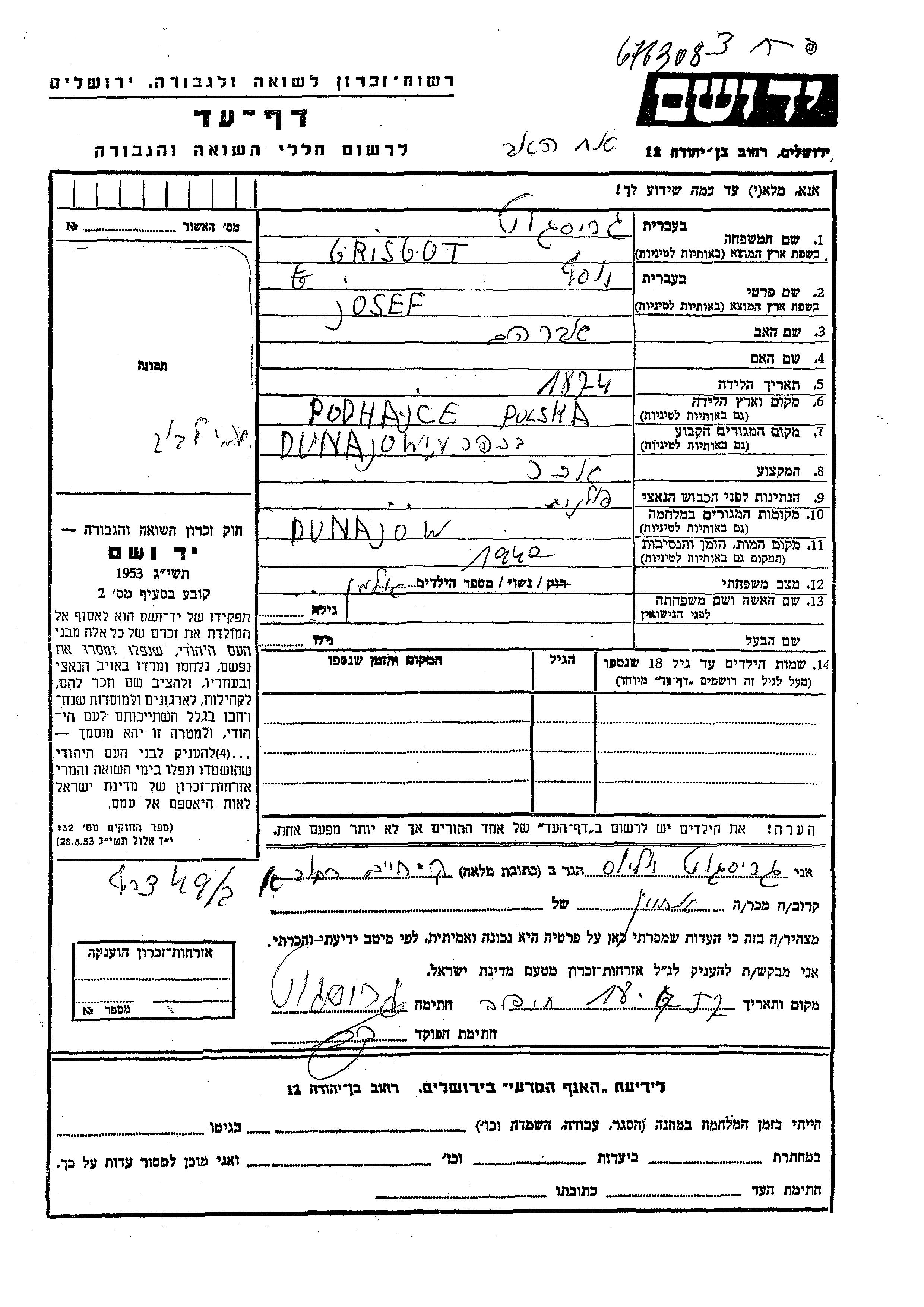 Josef Grisgot wurde im Jahr 1874 in Podhajce, Polen geboren. Er war der Sohn von Avraham. Er war Bauer/bäuerin und Witwer. Vor dem Zweiten Weltkrieg lebte er in Dunajow, Polen. Während des Krieges war er in Dunajow, Polen.