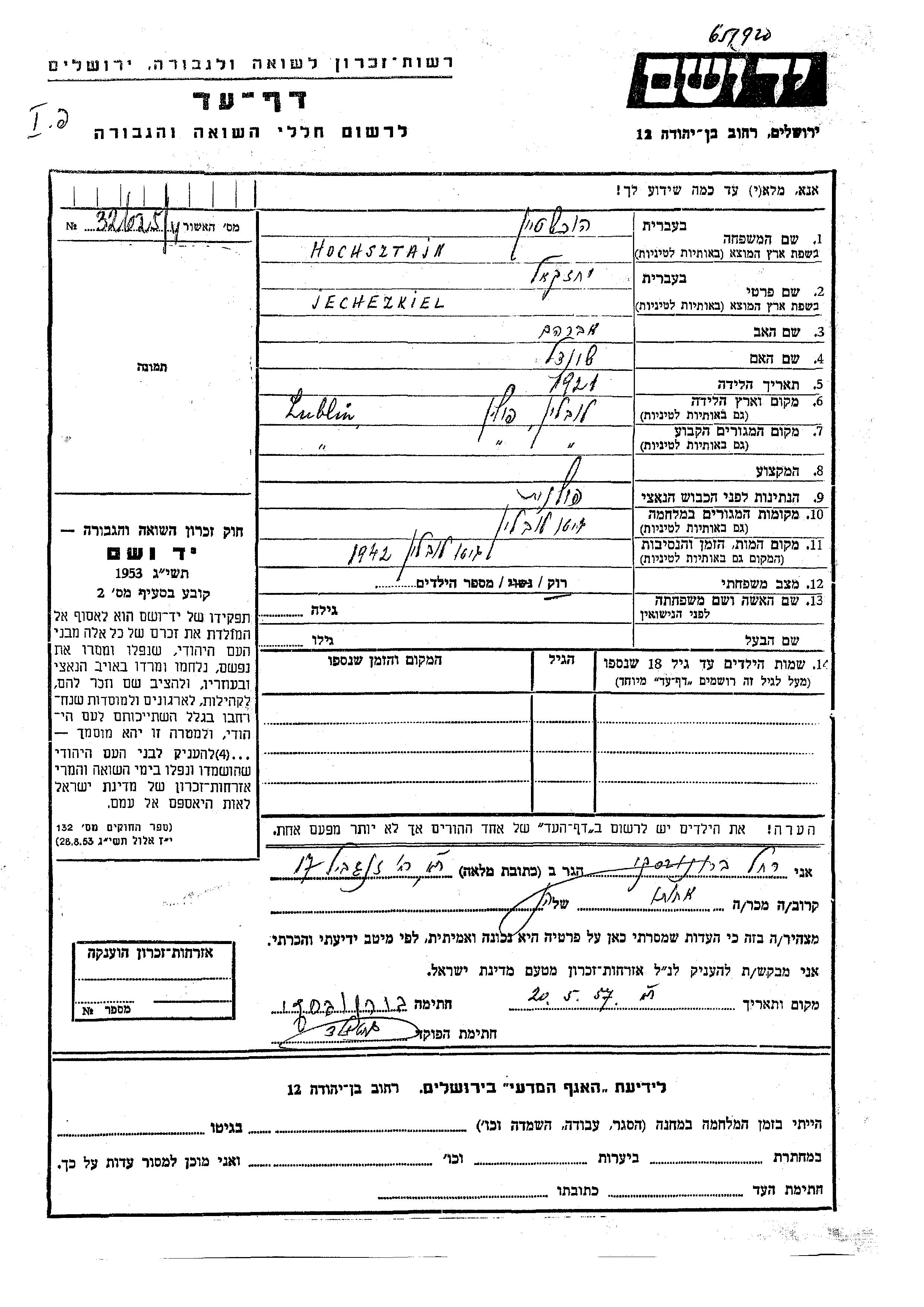 Hochsztajn Jechezkel 1921 Lublin, Polen Gedenkblatt