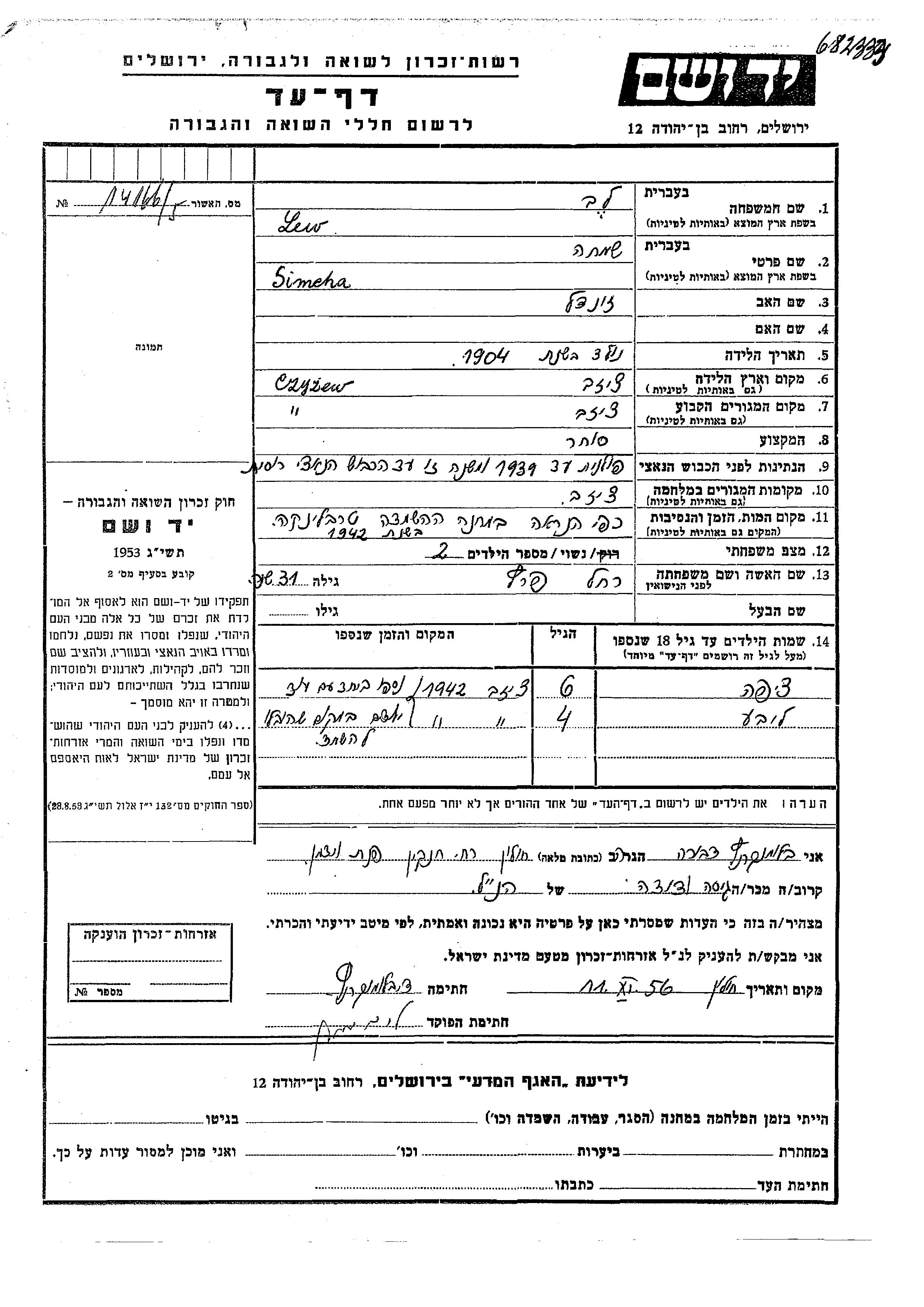 Simcha Lew wurde im Jahr 1904 in Czyzew, Polen geboren. Er war der Sohn von Zindel. Er war Kaufmann/-frau und mit Rakhel, geb. Peretz Verheiratet. Vor dem Zweiten Weltkrieg lebte er in Czyzew, Polen. Während des Krieges war er in Czyzew, Polen.