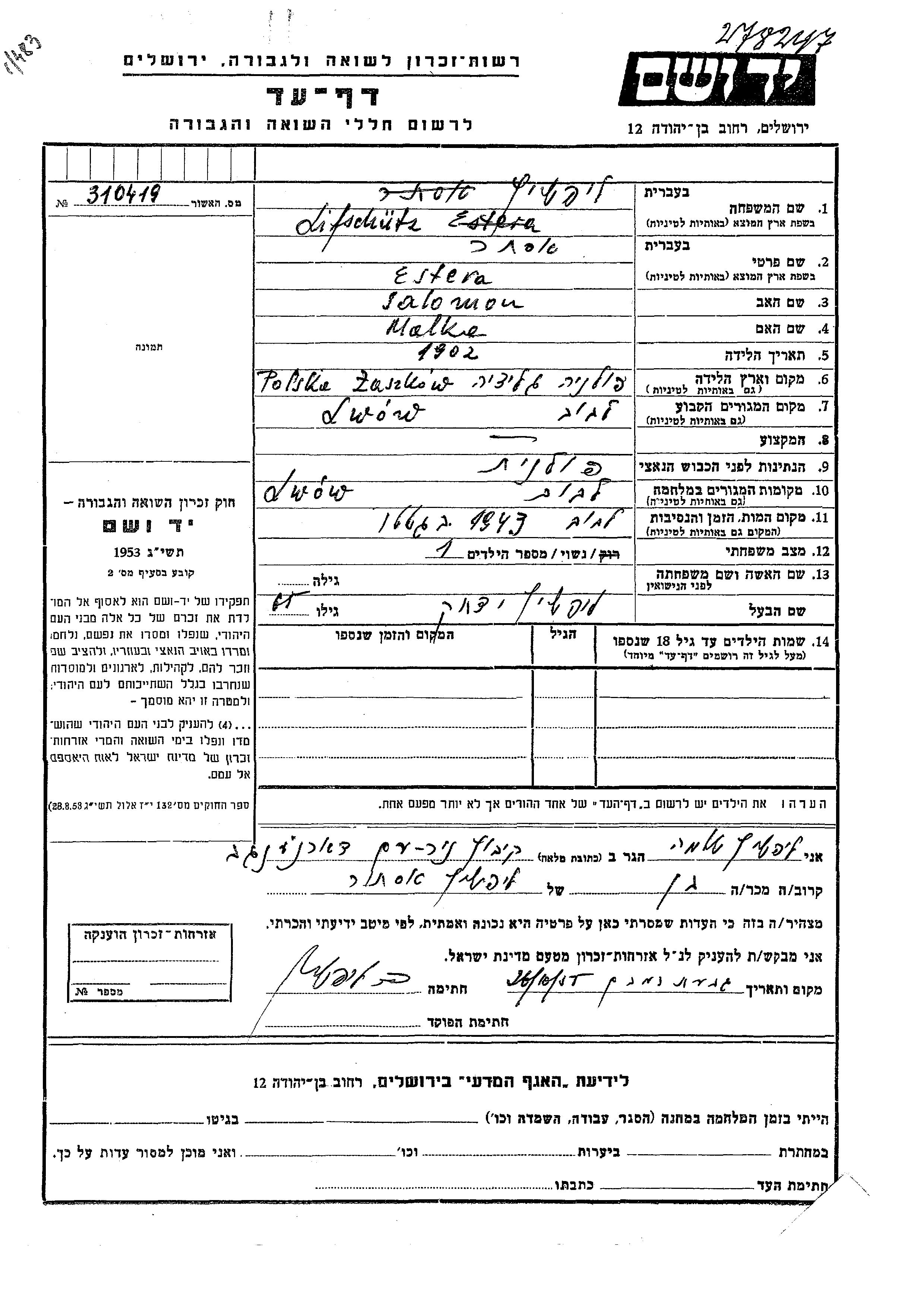 Estera Lifshitz wurde im Jahr 1902 in Galizien Region, Polen geboren. Sie war die Tochter von Salomon und Malka. Sie war mit Yitzkhak Verheiratet. Vor dem Zweiten Weltkrieg lebte sie in Lwow, Polen. Während des Krieges war sie in Lwow, Polen.