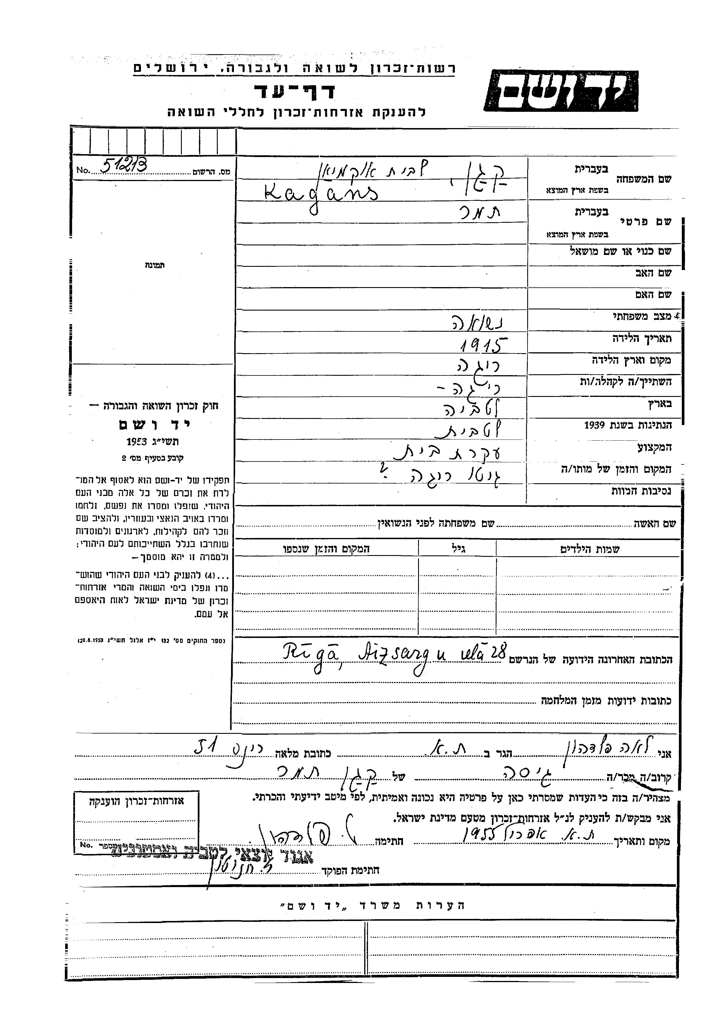 Tamar Kagan, geb. Okmian wurde im Jahr 1915 in Riga, Lettland geboren. Sie war Hausfrau und Verheiratet.