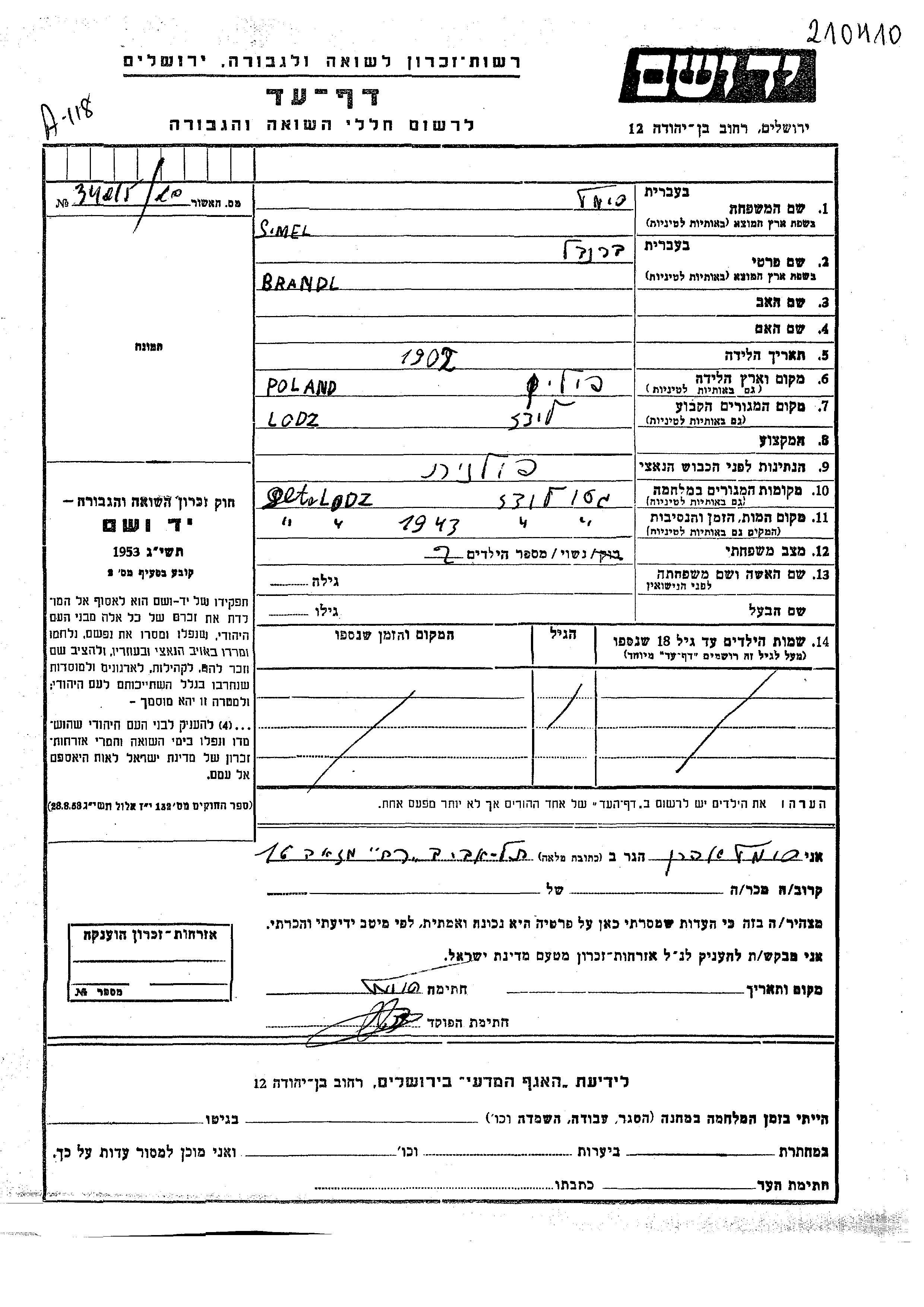 Brandl Simel wurde im Jahr 1902 in Polen geboren. Sie war Verheiratet. Vor dem Zweiten Weltkrieg lebte sie in Lodz, Polen. Während des Krieges war sie in Lodz, Polen.