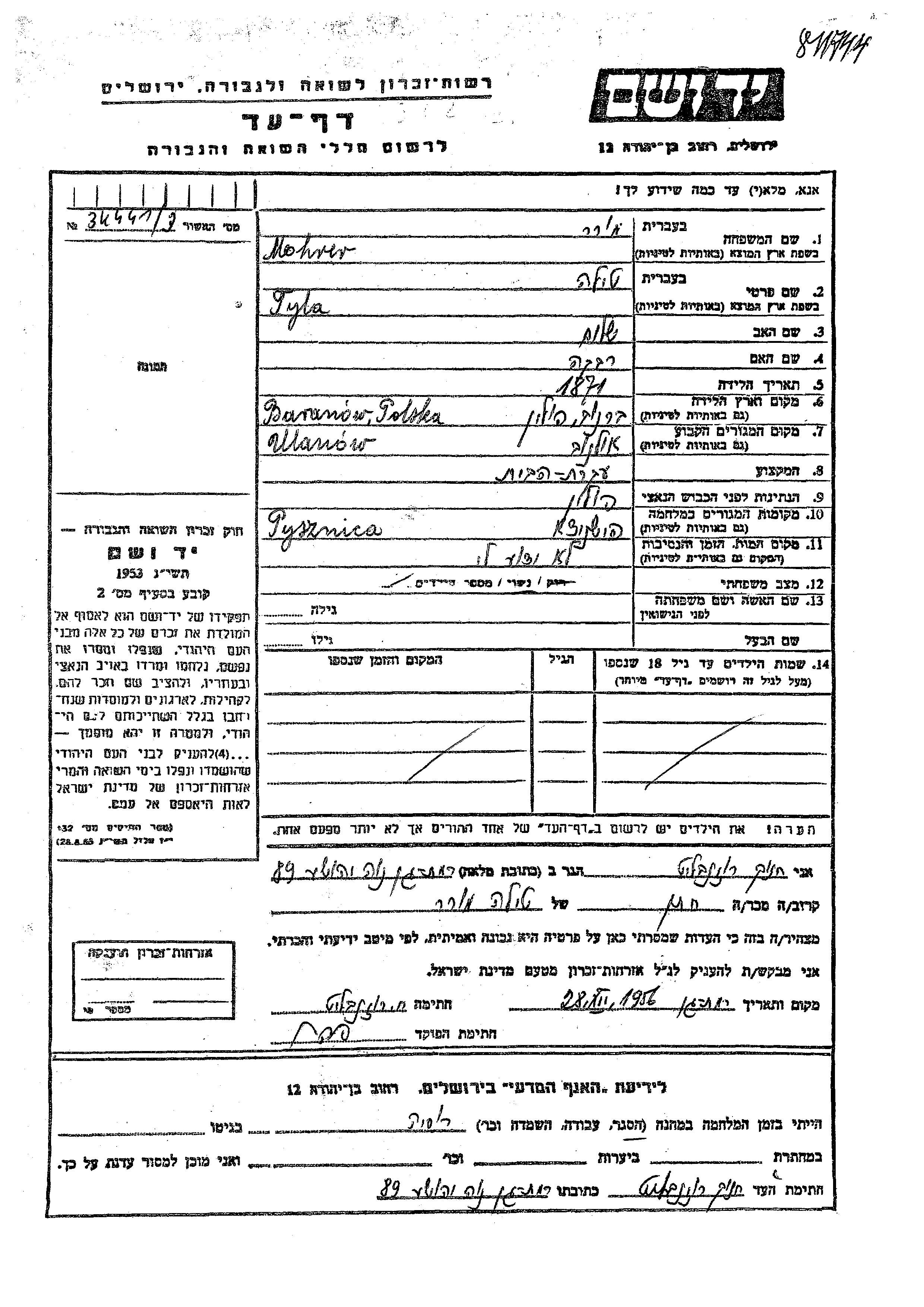 Tyla Mohrer wurde im Jahr 1871 in Baranów, Polen geboren. Sie war die Tochter von Shalom und Rivka. Sie war Hausfrau und Verheiratet. Vor dem Zweiten Weltkrieg lebte sie in Ulanow, Polen. Während des Krieges war sie in Pysznica, Polen.