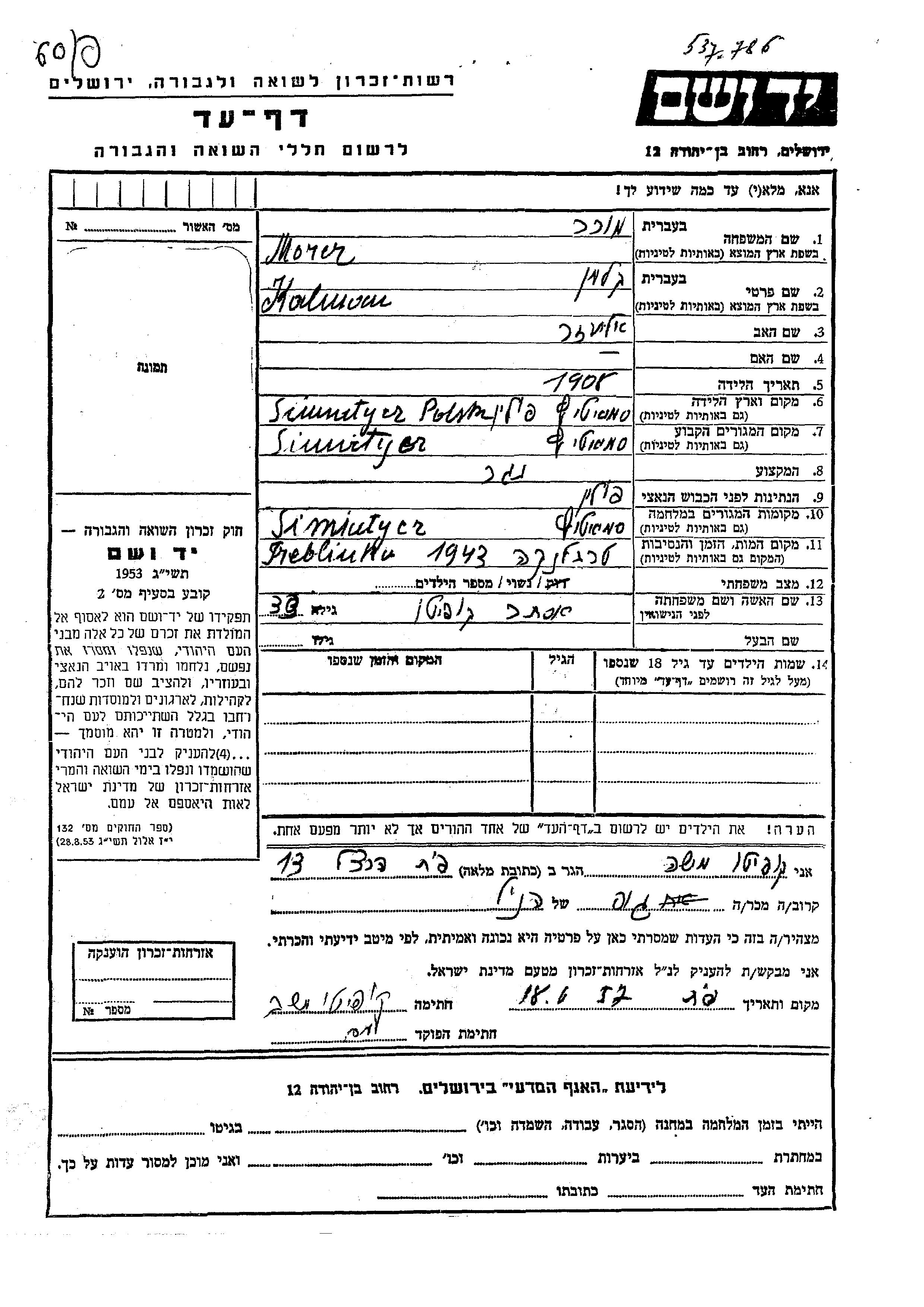 Clemon Kalman Morer wurde im Jahr 1905 in Simuatici, Polen geboren. Er war der Sohn von Eliezer. Er war Zimmermann und mit Ester, geb. Kopito Verheiratet. Vor dem Zweiten Weltkrieg lebte er in Simuatici, Polen. Während des Krieges war er in Simuatici, Polen.