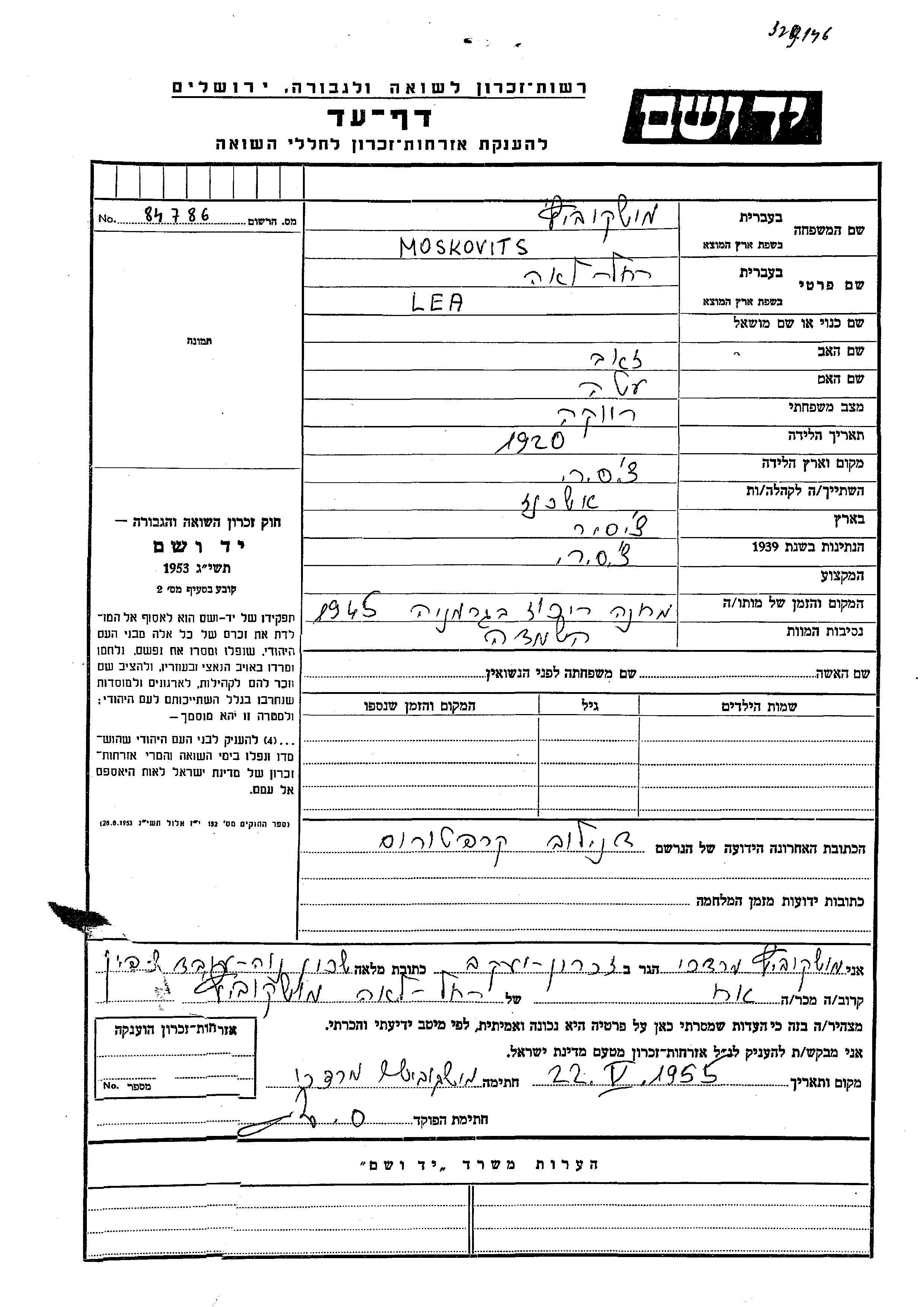 Rakhel Lea Moskovits wurde im Jahr 1920 in Tschechoslowakei geboren. Sie war die Tochter von Zeev und Ester. Sie war Ledig. Vor dem Zweiten Weltkrieg lebte sie in Danilove, Tschechoslowakei.