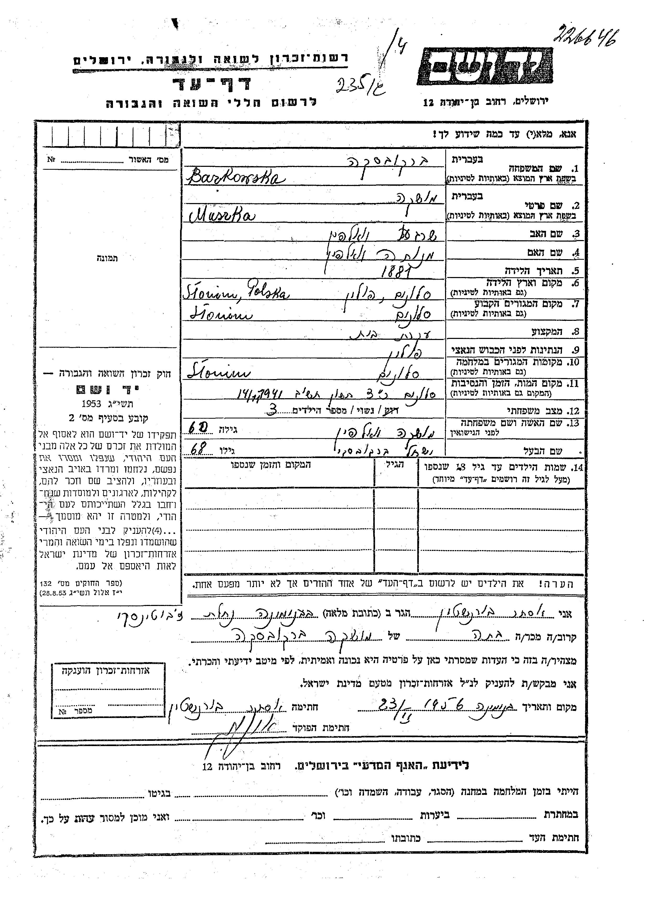 Muszka Muszke Barkowska wurde im Jahr 1881 in Slonim, Polen geboren. Er war der Sohn von Shraga und Menukha. Er war Hausfrau und mit Yisrael, geb. Volpin Verheiratet. Vor dem Zweiten Weltkrieg lebte er in Slonim, Polen. Während des Krieges war er in Slonim, Polen.