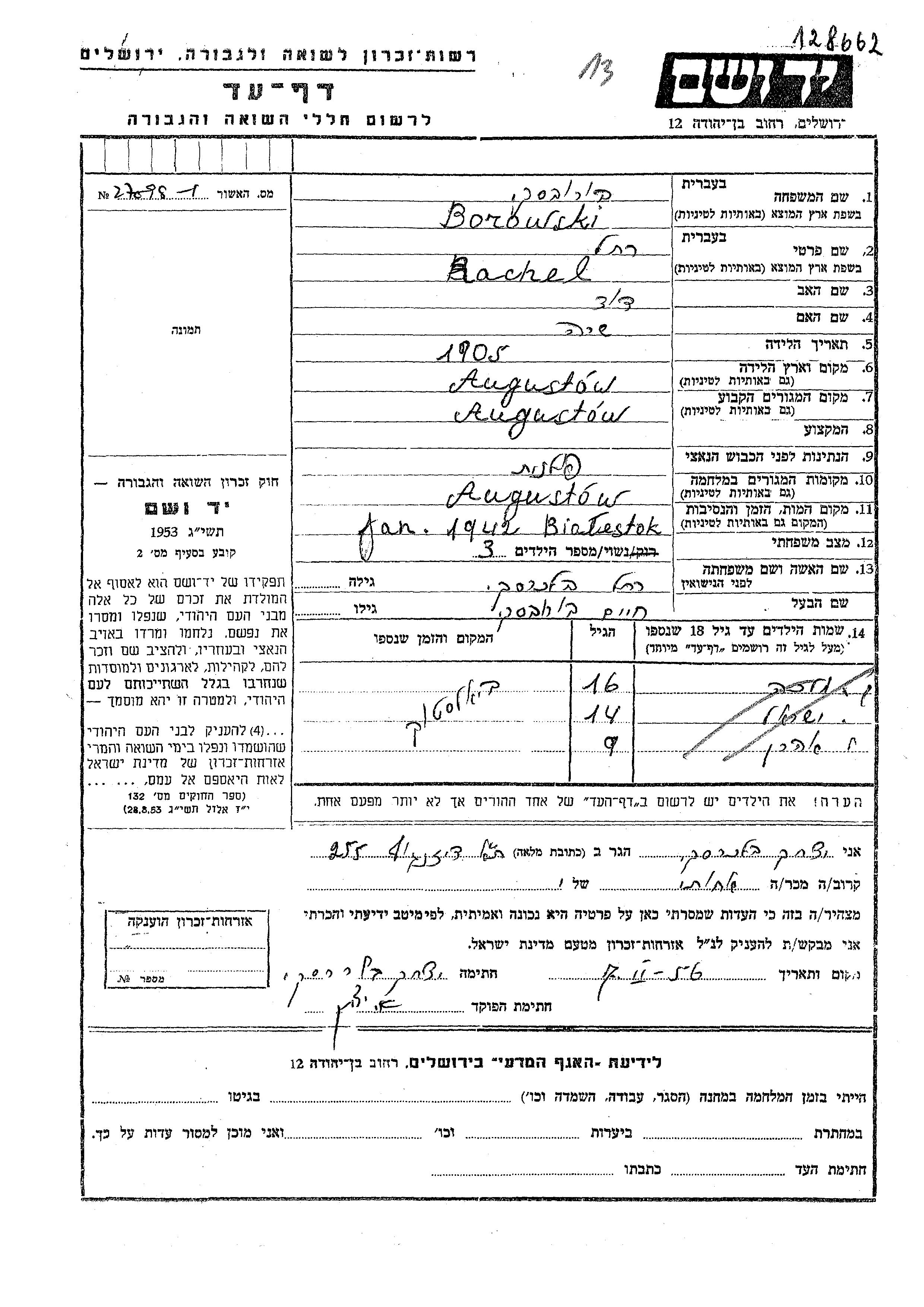 Borowski Rachel 1905 Augustów, Polen Gedenkblatt