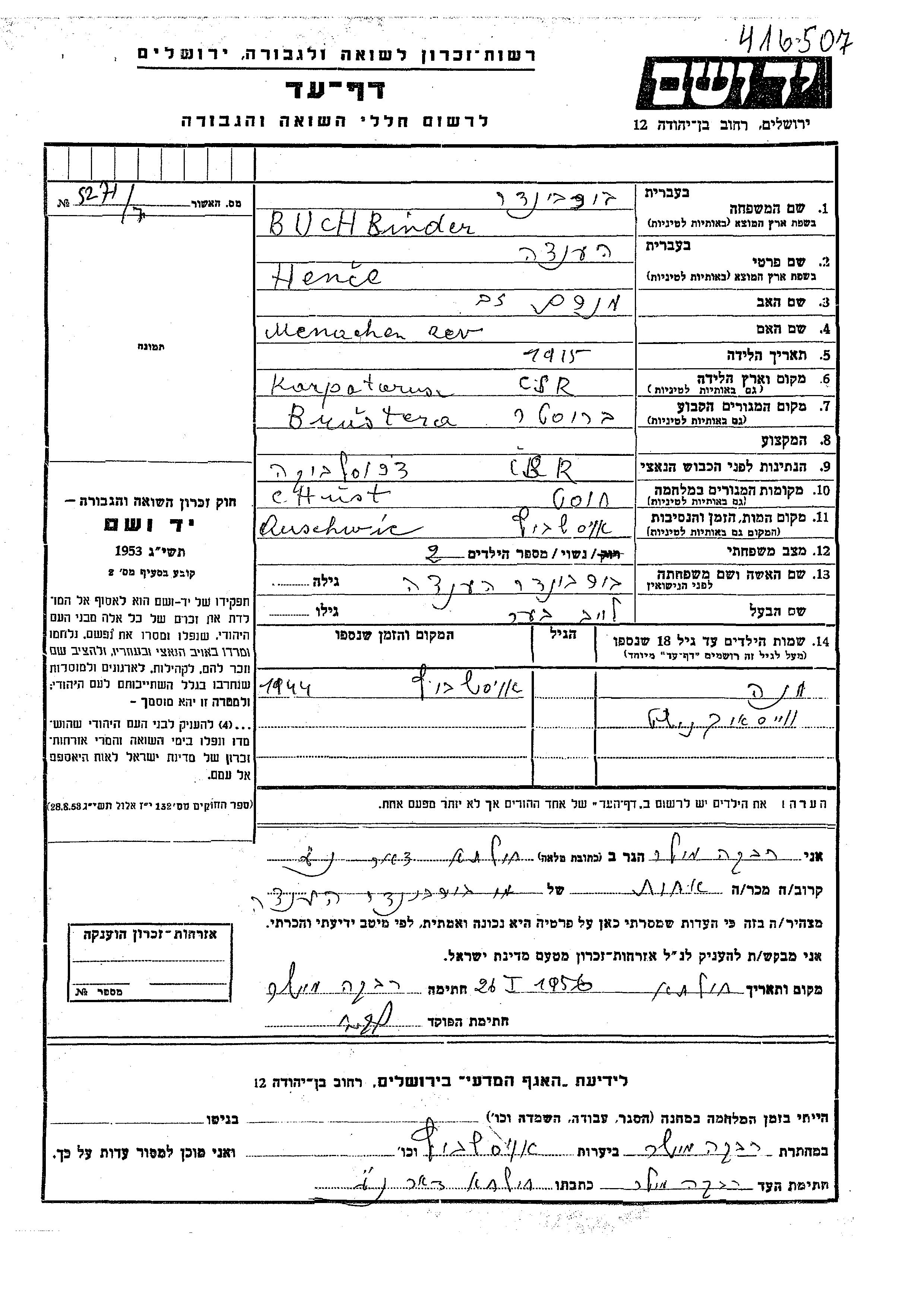 Hence Buchbinder wurde im Jahr 1915 in Carpathian Ruthenia, Tschechoslowakei geboren. Sie war die Tochter von Menachem Zeev. Sie war mit Leib Ber Verheiratet. Vor dem Zweiten Weltkrieg lebte sie in Brustura, Tschechoslowakei. Während des Krieges war sie in Chust, Tschechoslowakei.