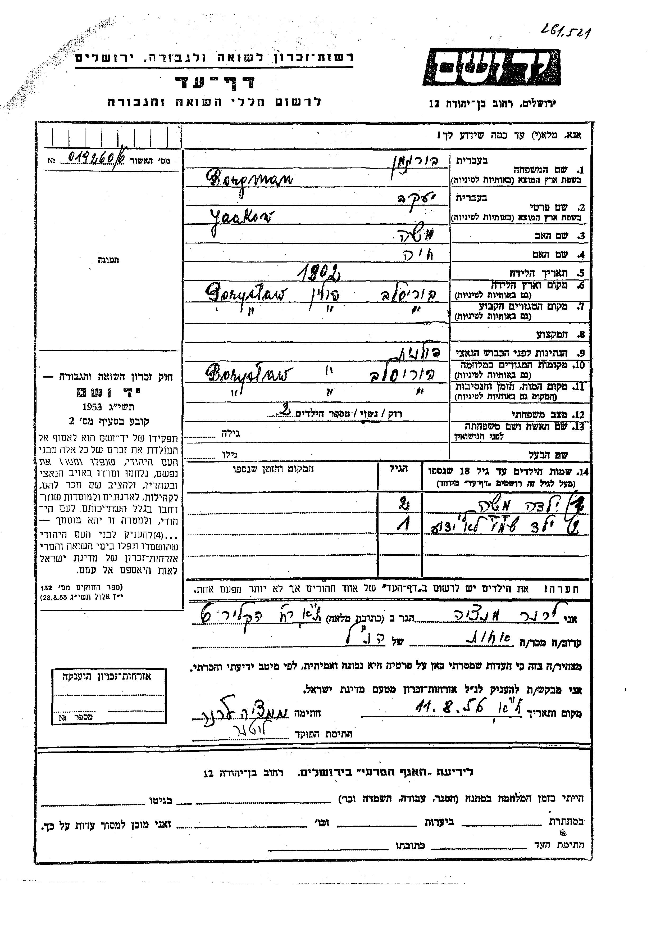 Yaakow Borgman wurde im Jahr 1902 in Boryslaw, Polen geboren. Er war der Sohn von Moshe und Khaia. Er war Verheiratet. Vor dem Zweiten Weltkrieg lebte er in Boryslaw, Polen. Während des Krieges war er in Boryslaw, Polen.