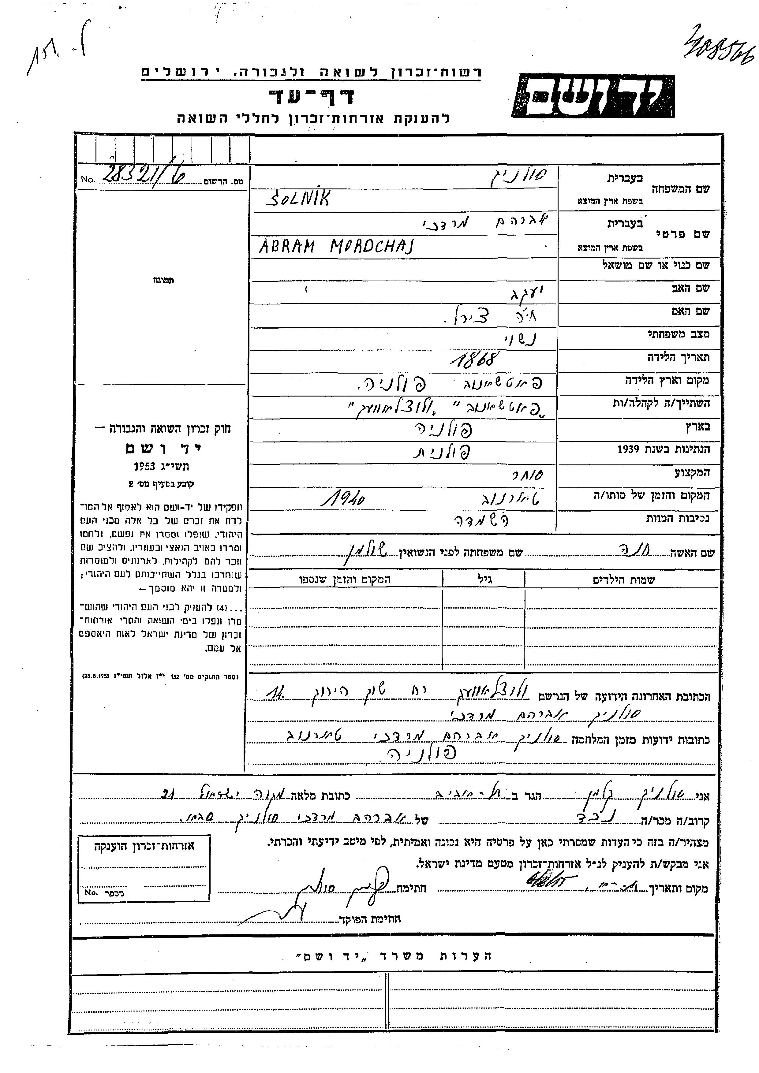 Abram Mordchaj Solnik wurde im Jahr 1868 in Pacanow, Polen geboren. Er war der Sohn von Yaakov und Khaia Tzirel. Er war Kaufmann/-frau. Vor dem Zweiten Weltkrieg lebte er in Pacanow, Polen. Während des Krieges war er in Tarnow, Polen.