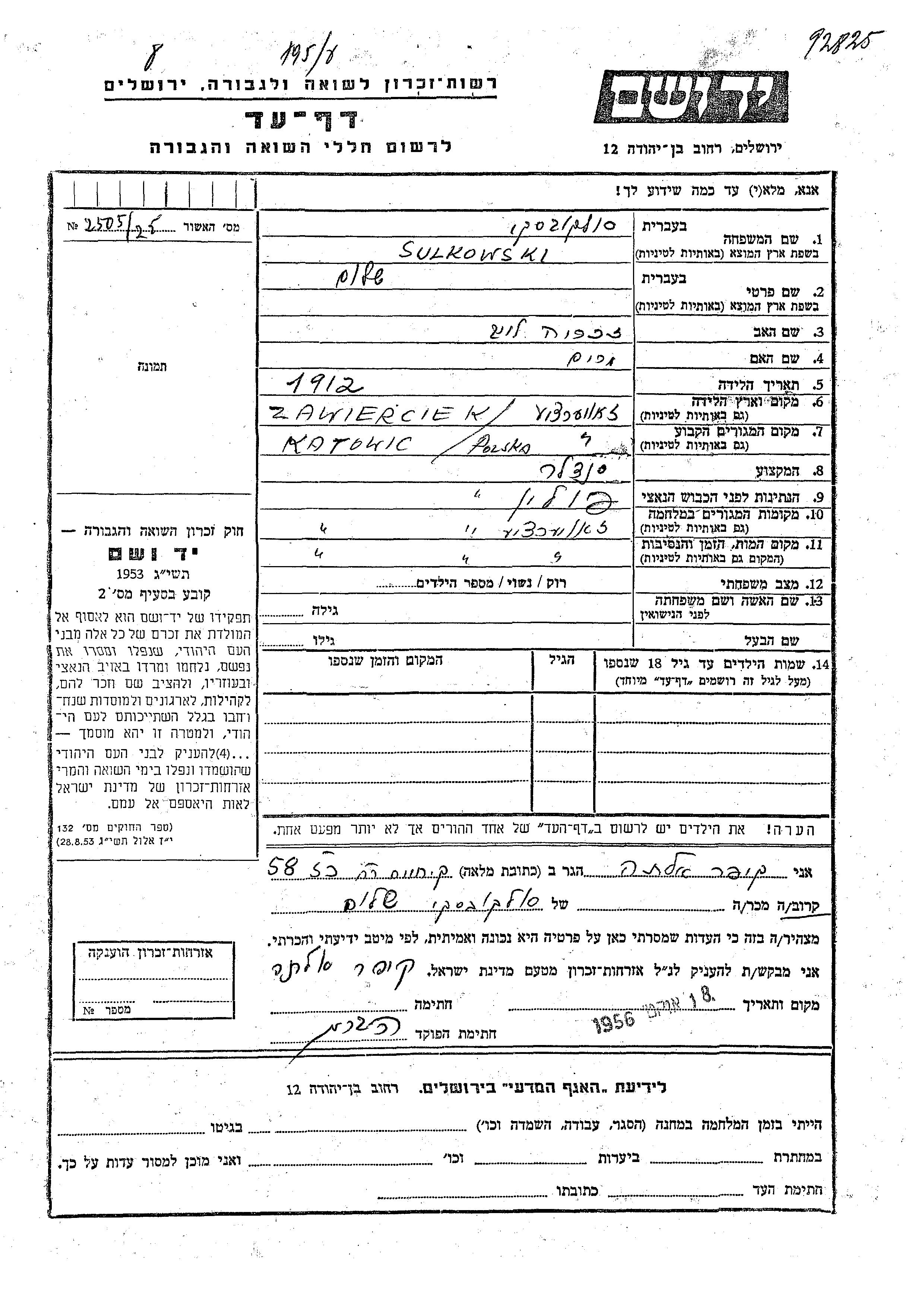 Shalom Sulkowski wurde im Jahr 1912 in Zawiercie, Polen geboren. Er war der Sohn von Zakharia Leib und Miriam. Er war Schuster/-in. Vor dem Zweiten Weltkrieg lebte er in Katowice, Polen. Während des Krieges war er in Zawiercie, Polen.