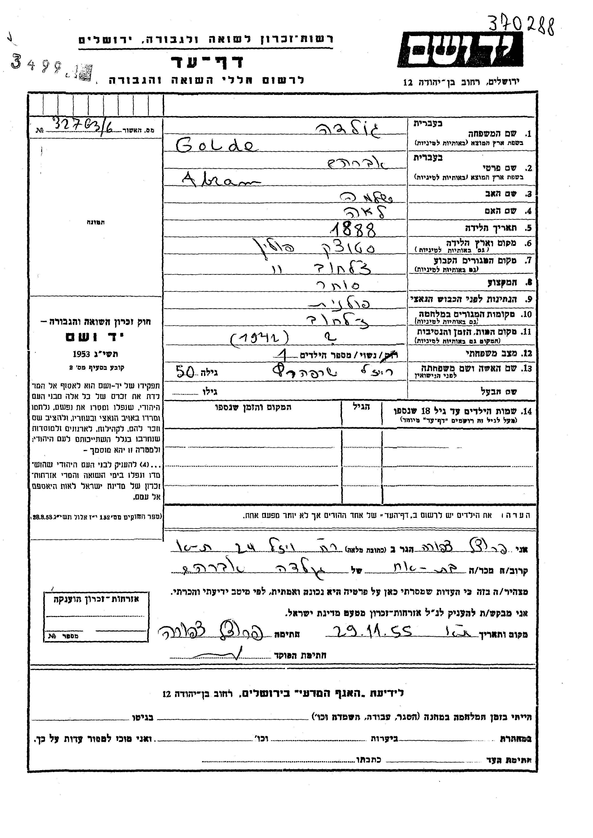 Abram Golde wurde im Jahr 1888 in Stochek, Polen geboren. Er war der Sohn von Shlomo und Lea. Er war Kaufmann/-frau und mit Reizl, geb. Sharfhartz Verheiratet. Vor dem Zweiten Weltkrieg lebte er in Zelechow, Polen. Während des Krieges war er in Zelechow, Polen.