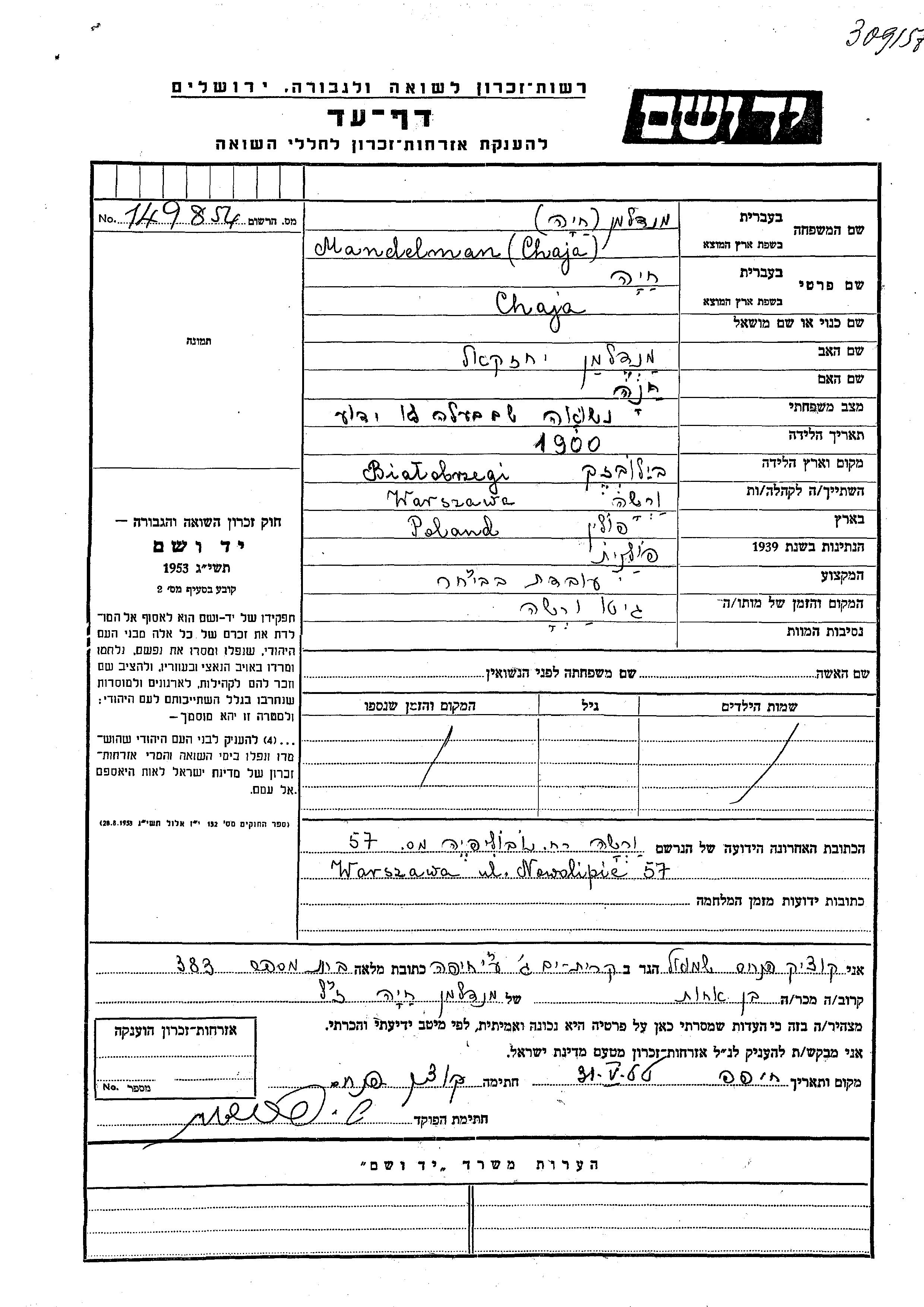 Chaja Mandelman wurde im Jahr 1900 in Bialobrzegi, Polen geboren. Sie war die Tochter von Yekhezkel und Khana. Sie war Verheiratet. Während des Krieges war sie in Warsaw, Polen.