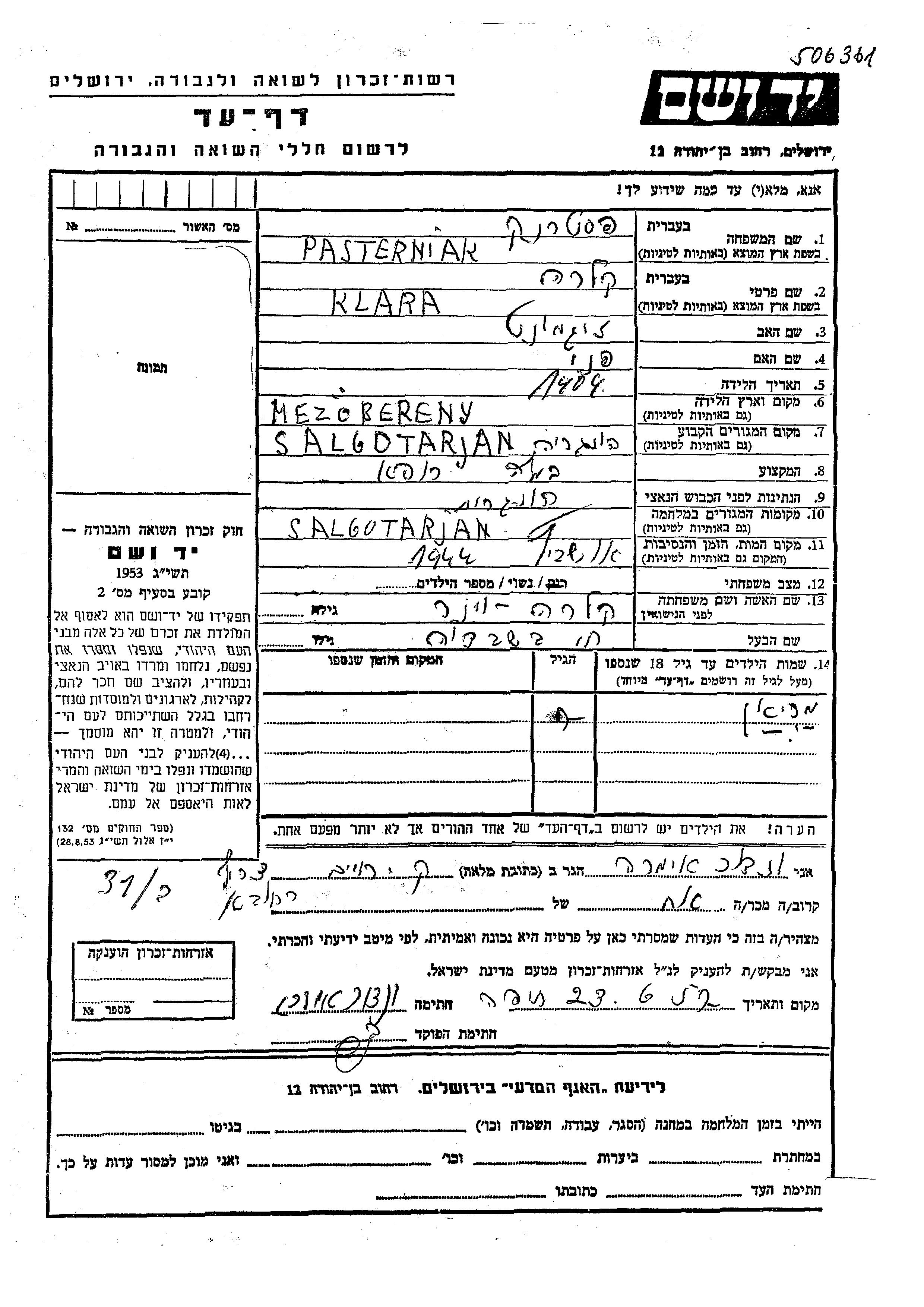 Klara Pasternak, geb. Viner wurde im Jahr 1904 in Mezobereny, Ungarn geboren. Sie war die Tochter von Zhigmunt und Fani. Sie war Verheiratet. Vor dem Zweiten Weltkrieg lebte sie in Salgotarjan, Ungarn. Während des Krieges war sie in Salgotarjan, Ungarn.