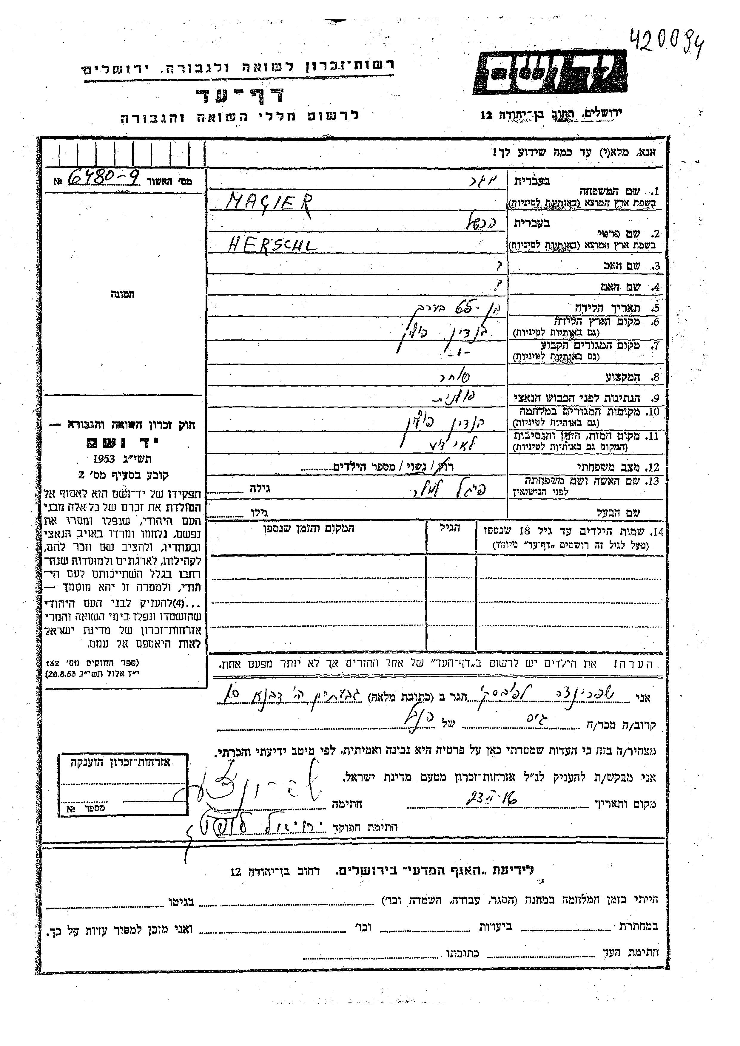 Herschl Magier wurde in Będzin, Polen geboren. Er war Kaufmann/-frau und mit Feigel, geb. Lemler Verheiratet. Vor dem Zweiten Weltkrieg lebte er in Będzin, Polen. Während des Krieges war er in Będzin, Polen.