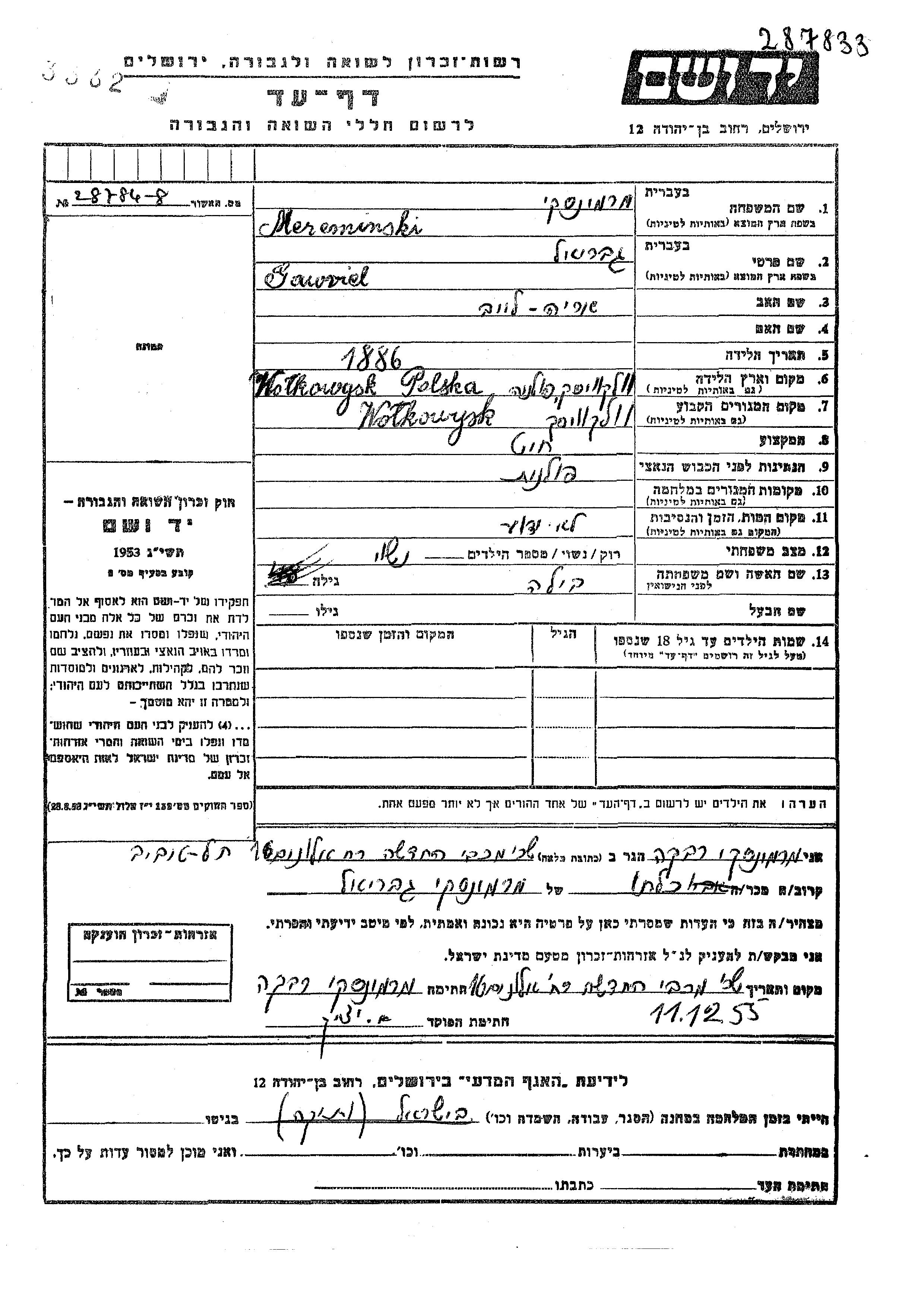Gavriel Mereminski wurde im Jahr 1886 in Wolkowysk, Polen geboren. Er war der Sohn von Arie Leib. Er war Schneider und mit Bila Verheiratet. Vor dem Zweiten Weltkrieg lebte er in Wolkowysk, Polen.