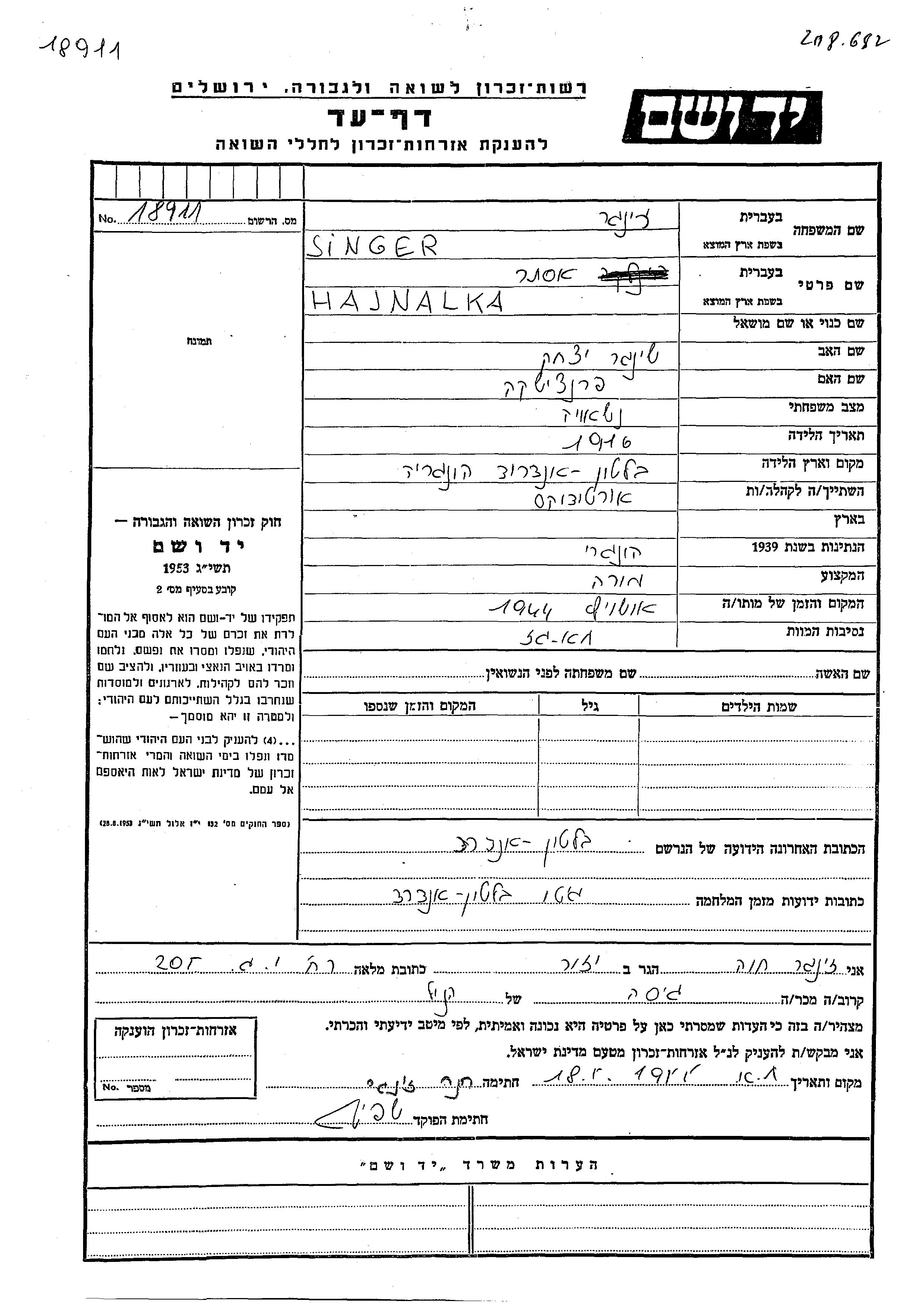 Hajnalka Ester Singer wurde im Jahr 1916 in Balatonendred, Ungarn geboren. Sie war die Tochter von Yitzkhak und Frantziska. Sie war Lehrer/in. Vor dem Zweiten Weltkrieg lebte sie in Balatonendred, Ungarn. Während des Krieges war sie in Balatonendred, Ungarn.