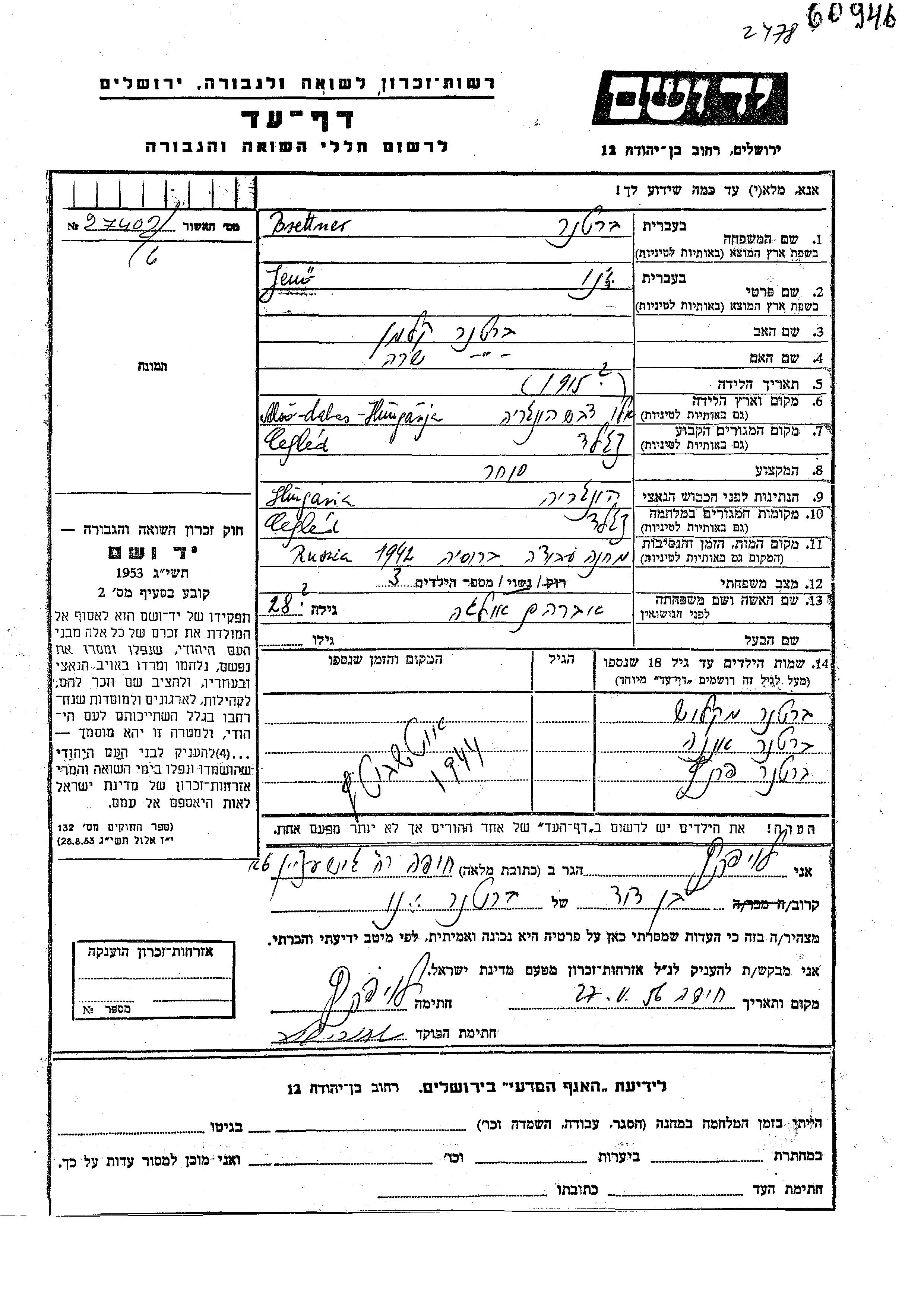 Jeno Brettner wurde im Jahr 1915 in Also Dabas, Ungarn geboren. Er war der Sohn von Kalman und Sara. Er war Kaufmann/-frau und mit Olga, geb. Avraham Verheiratet. Vor dem Zweiten Weltkrieg lebte er in Cegled, Ungarn. Während des Krieges war er in Cegled, Ungarn.